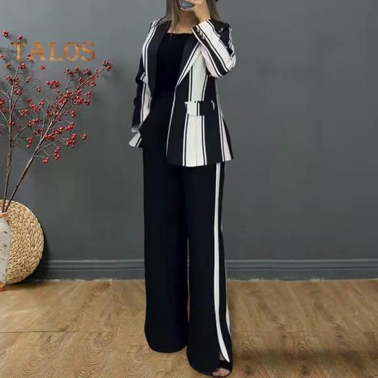 Придайте изысканность пиджаку с лацканами, застегивающемуся на одну пуговицу и имеющему 2 боковых кармана.. Полосатая строчка придает элегантность этому комплекту в стиле OL, который идеально подходит для разных случаев.