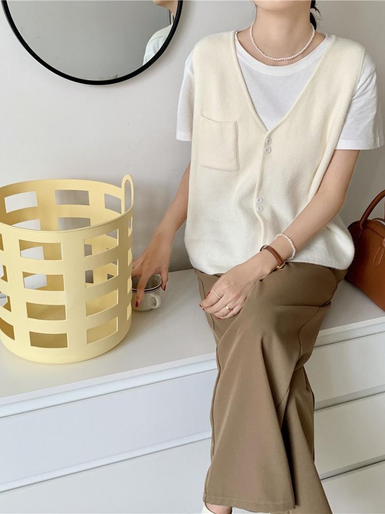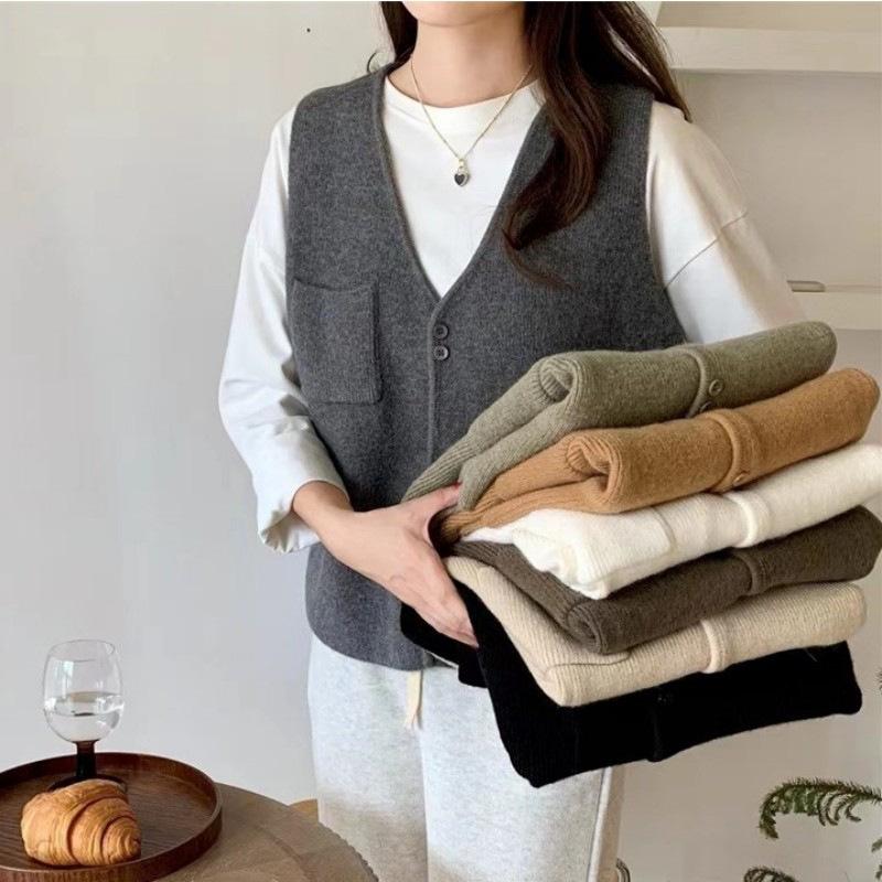 Корейская версия однотонный карманный вязаный жилет кардиган женский осень зима новый свободный модный V-образный вырез без рукавов свитер жилет
