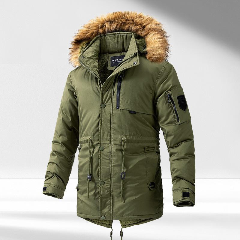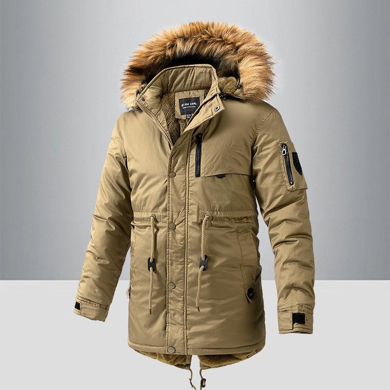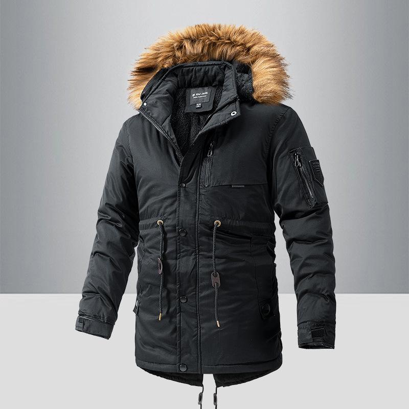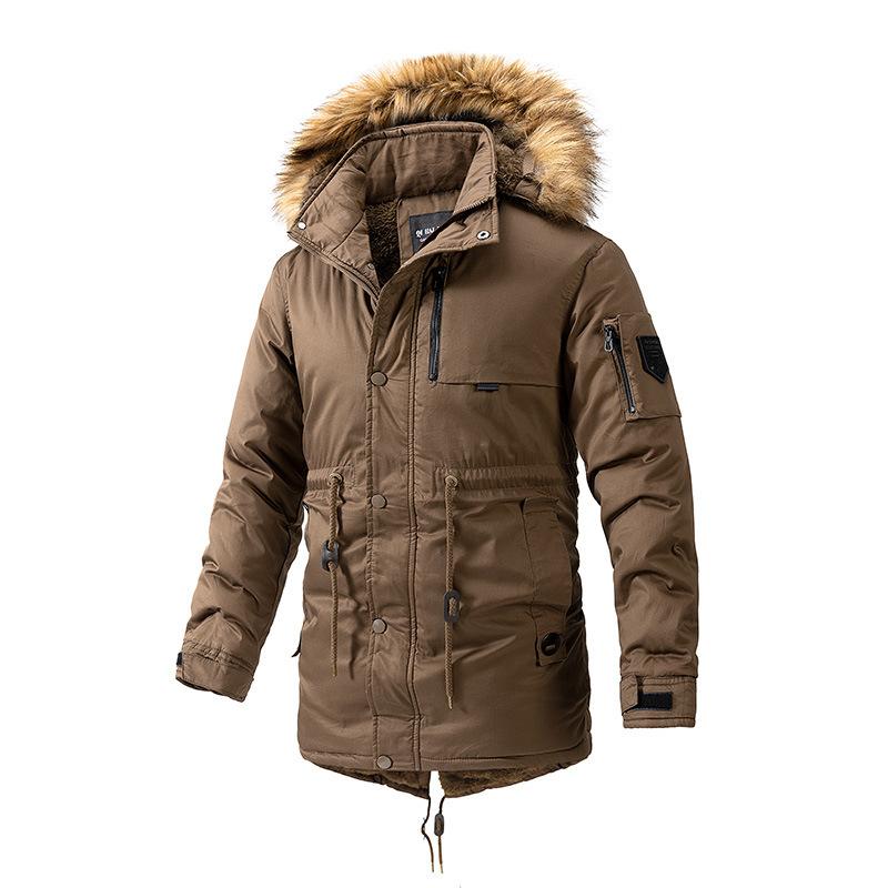Мужское зимнее пальто средней длины из хлопка с утолщенным бархатом и большим меховым воротником с капюшоном из хлопка