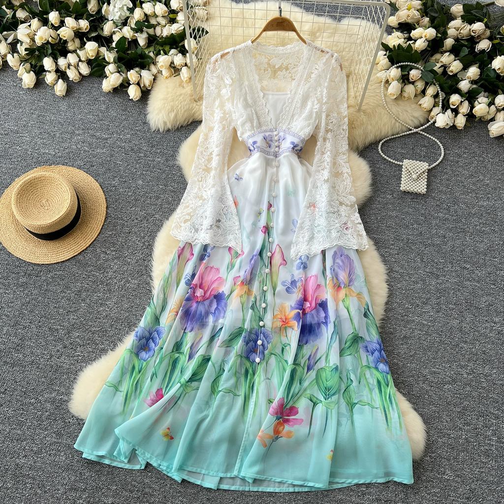 Весна Осень Женские Элегантные Кружева Расклешенные Рукава Глубокий V-образный Вырез Принт Длинные Макси Праздничные Платья Для Вечеринок