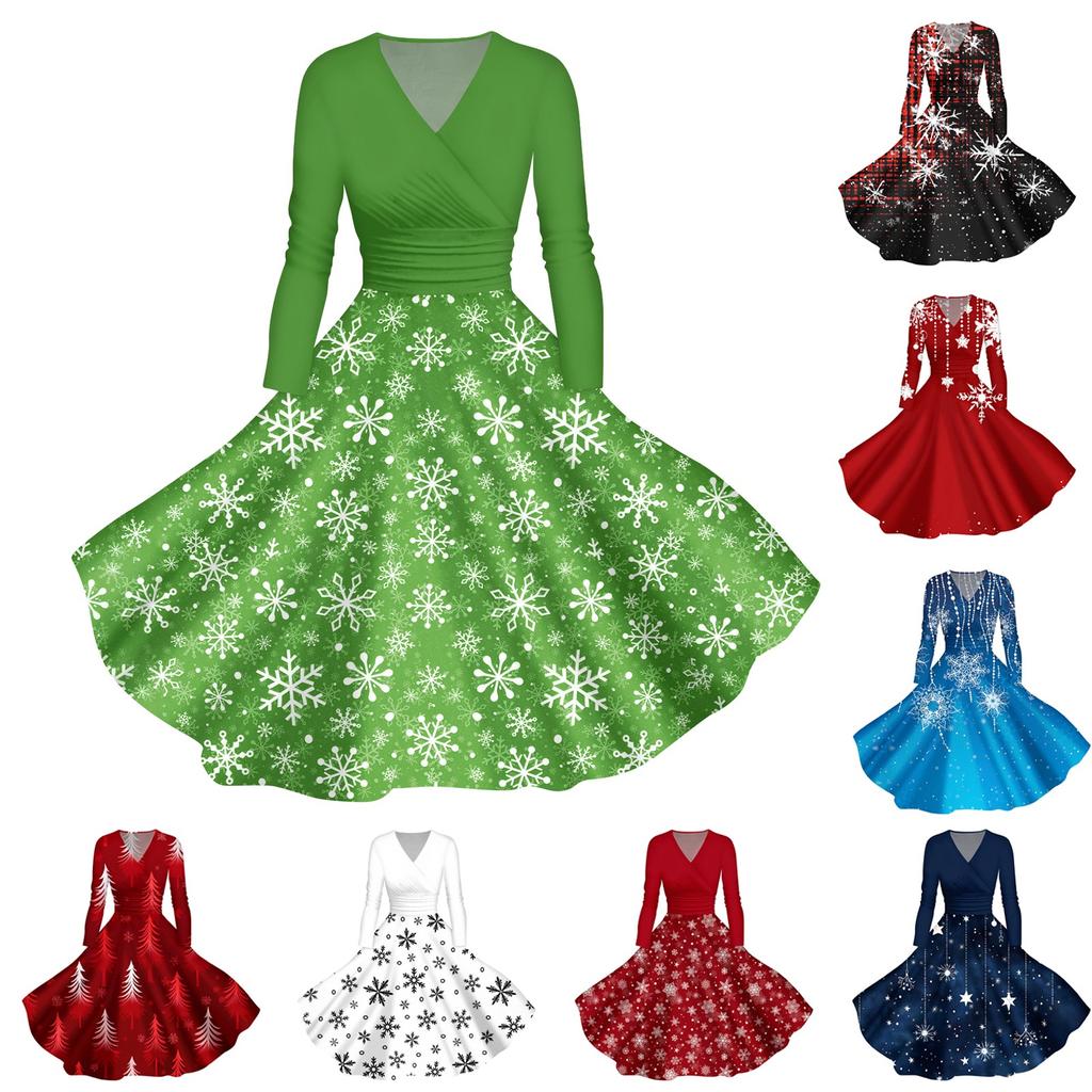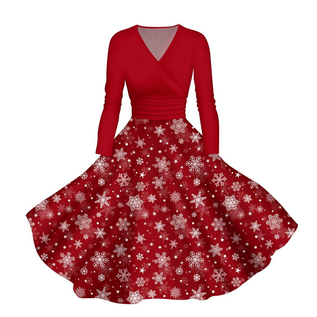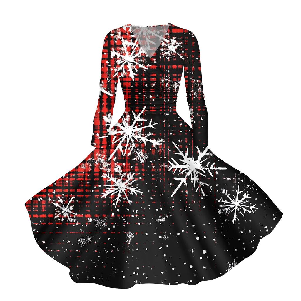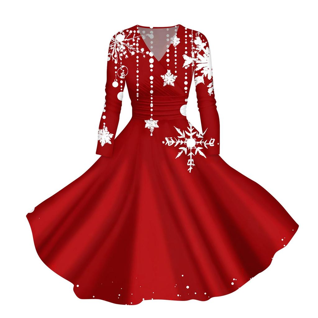 Женское повседневное модное платье с V-образным вырезом и длинными рукавами в стиле ретро с рождественским принтом в стиле ретро, осень