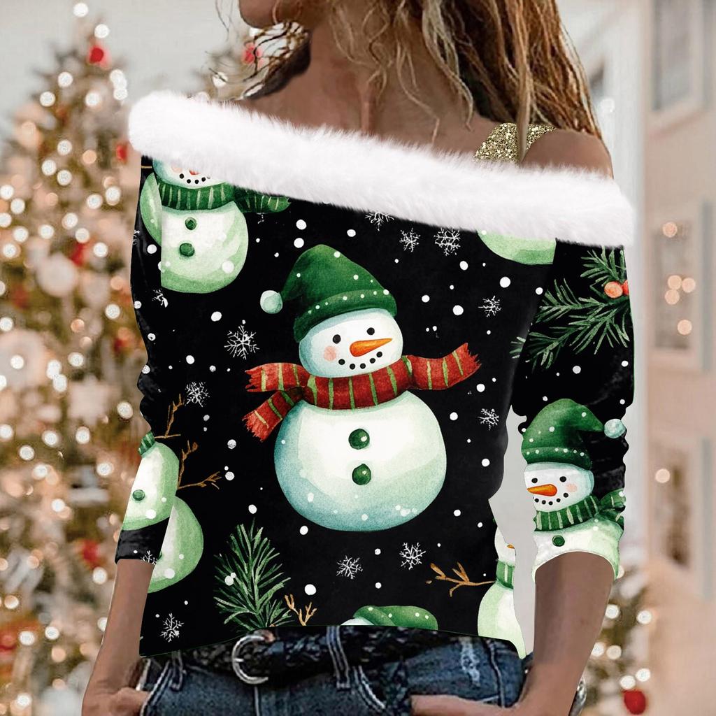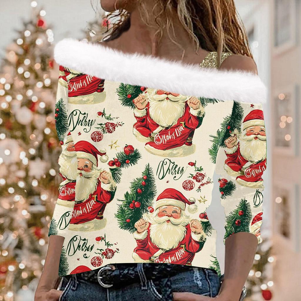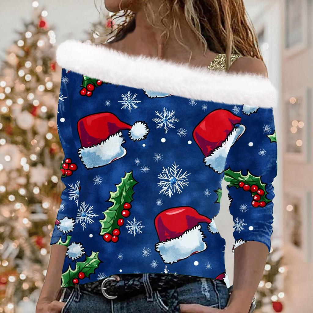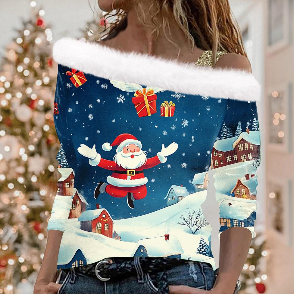 Женский повседневный модный топ с длинными рукавами и открытыми плечами с рождественским принтом из плюша