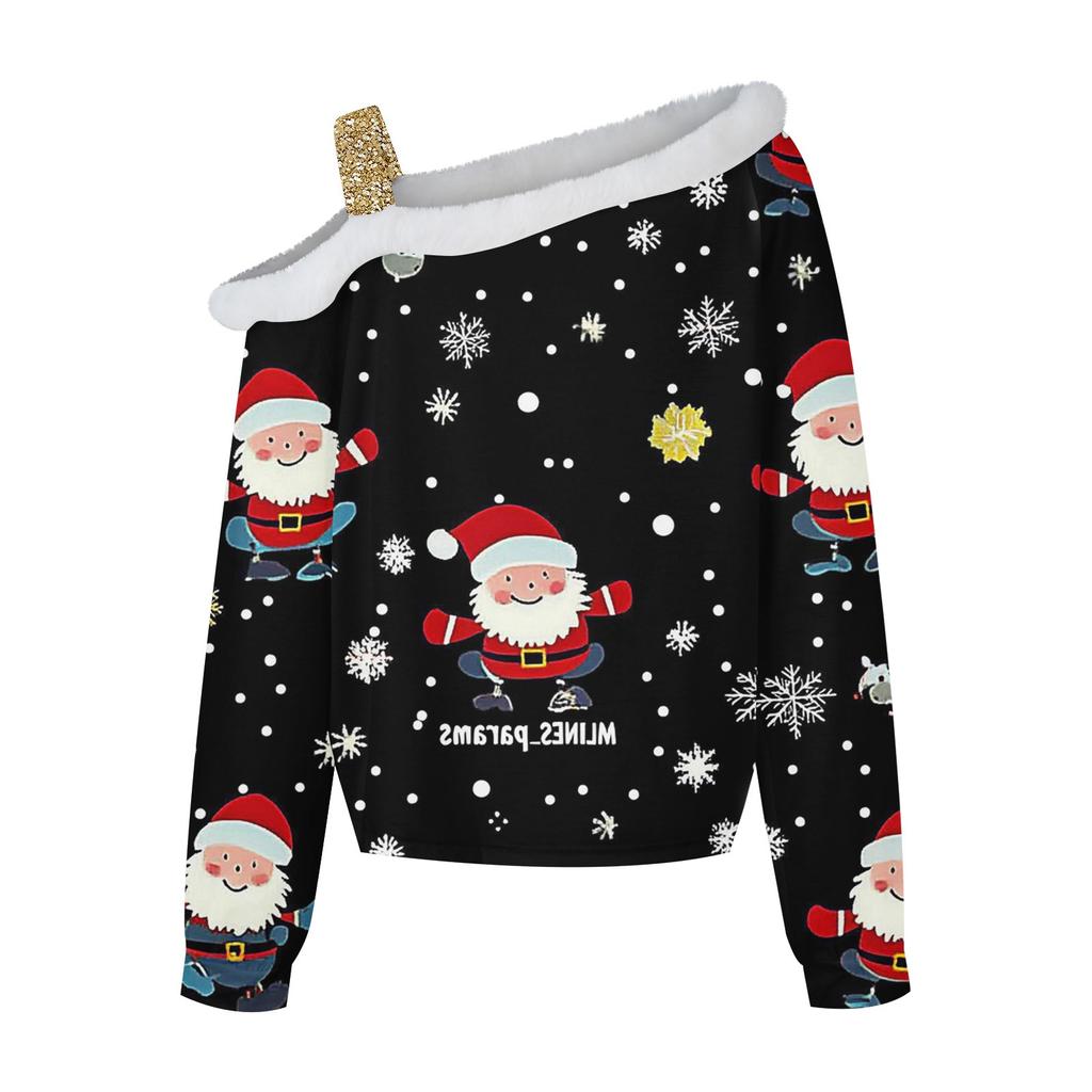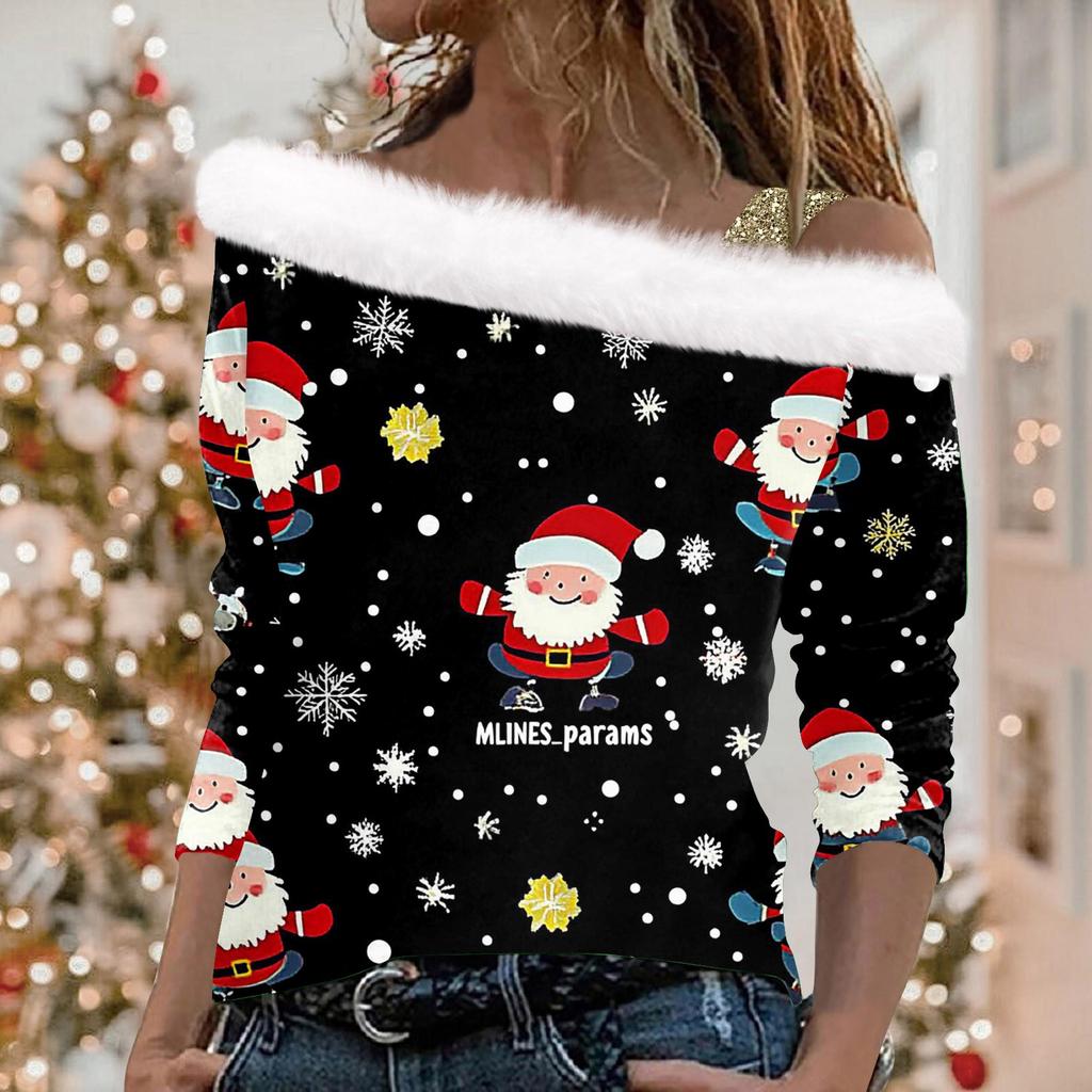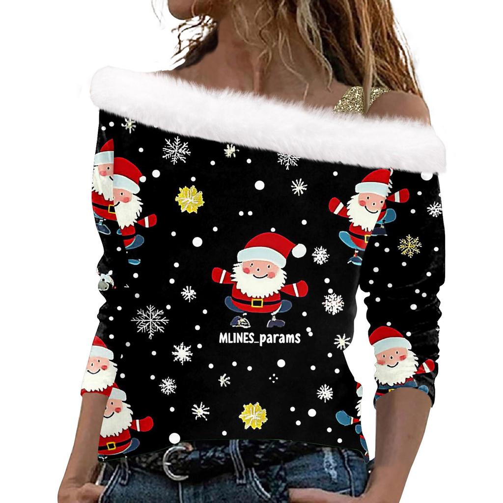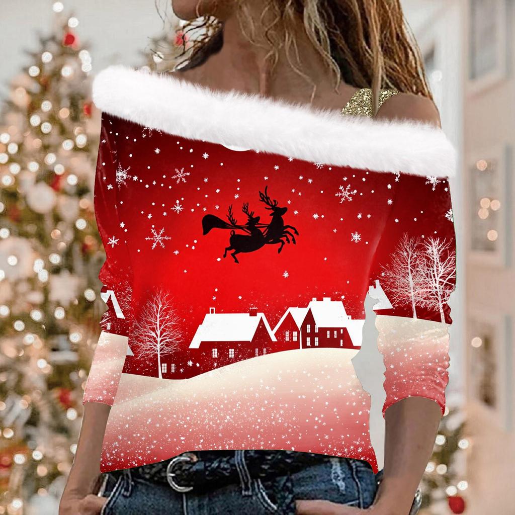 Женский повседневный модный топ с длинными рукавами и открытыми плечами с рождественским принтом из плюша