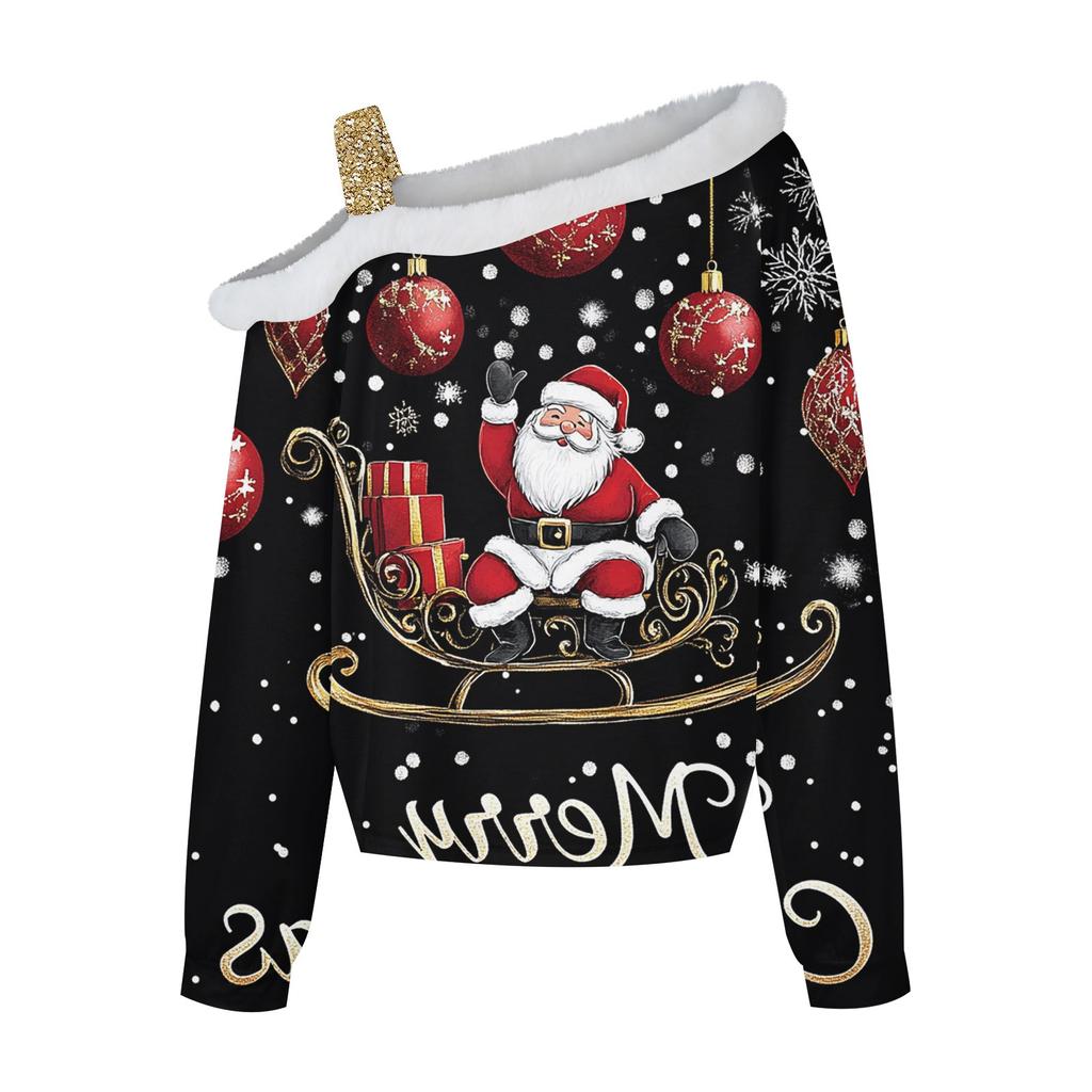 Женский повседневный модный топ с длинными рукавами и открытыми плечами с рождественским принтом из плюша