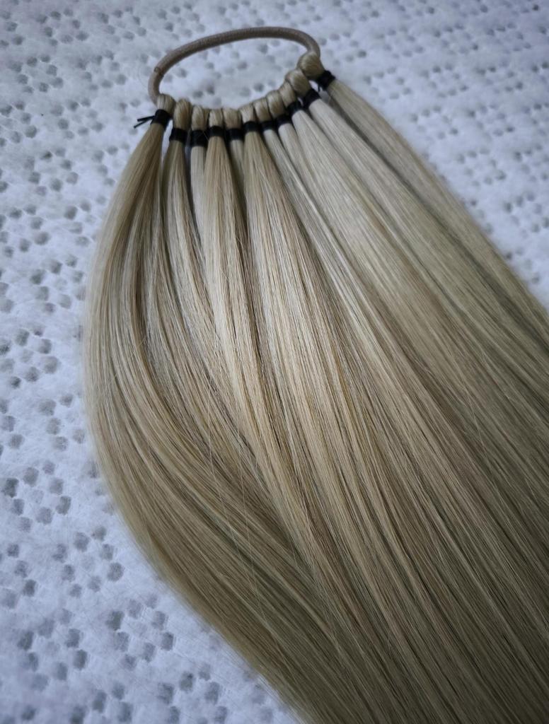 Волосы ничего так, но на недолго хватает. Одна прядка после первой носки распалась, выкинула. Волоски постоянно вытягиваются из прядок и их приходится подрезать. При снятии с хвоста путаются неимоверно и потому вытягиваются. А прядки состоят из сложенных пополам волосков и связанных в перегибе. Всё. Я думала, что хоть прошьют их как-то. Но нет.
