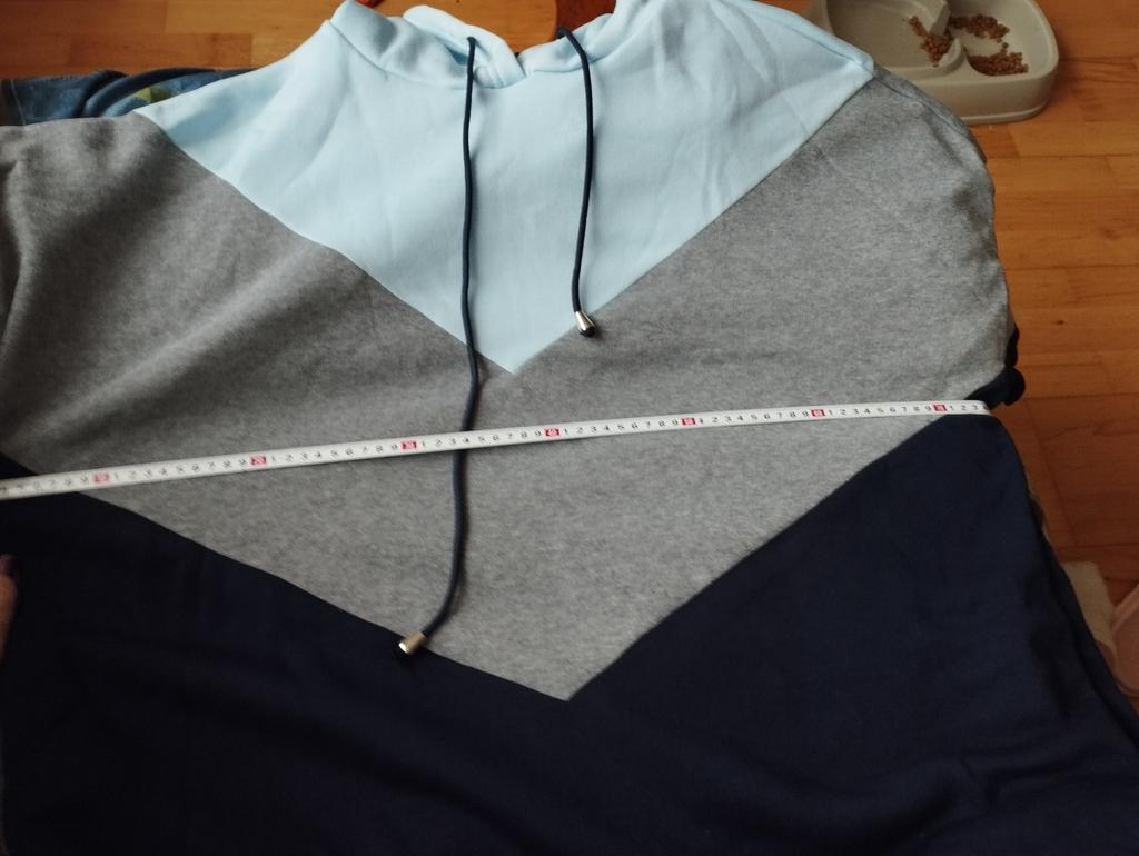 На мой ОГ 128см. -- очень свободно. Хорошая длина рукава.Длина худи для моего роста 165см. полностью закрывает колено. Зауженный низ совсем не сковывает движения при ходьбе.Ткань синтетика,но статики не заметила. Сочетание цветов очень красивое. В общем и целом мне моё приобретение пришлось по душе. Пришло в сборной посылке за 15 дней. Спасибо JOOM.😊👌🌸