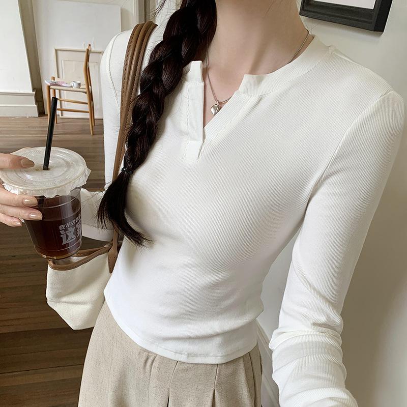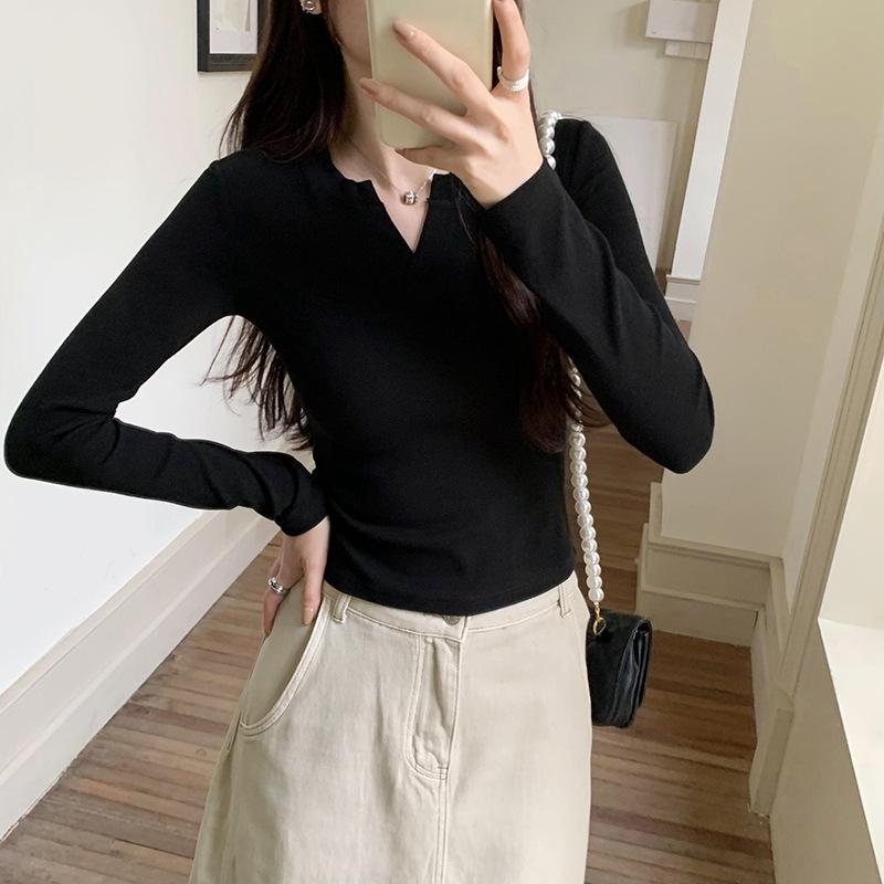 Футболка с длинными рукавами и полуоткрытым воротником Temperament для женщин, утягивающая базовая рубашка для начала осени, простая со всем верхом
