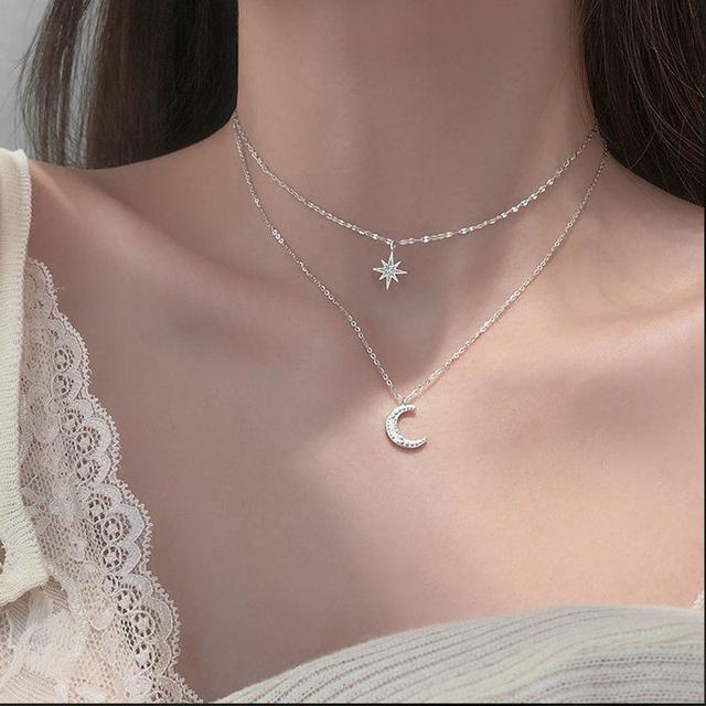 Двухслойное ожерелье из стерлингового серебра 925 пробы со звездой и луной. Блестящие подвески из циркония. Ожерелья для женщин. Подарочные ювелирные украшения. Аксессуары.