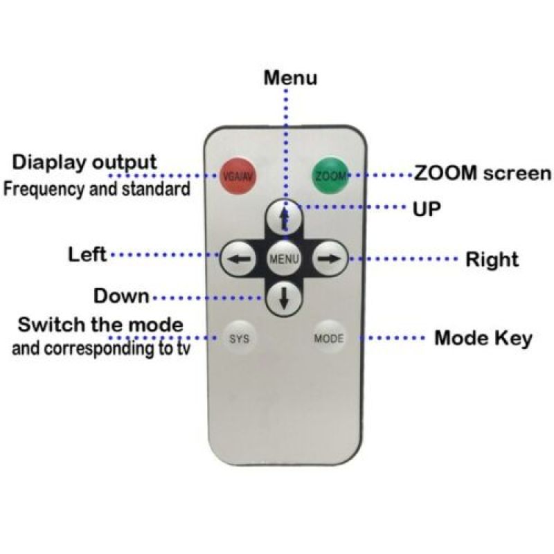 Частота выходного ТВ/РЧ сигнала составляет 61,25 МГц. Пожалуйста, используйте функцию поиска канала вашего телевизора, чтобы получить сигнал, затем нажмите «SYS», чтобы настроить формат(PAL ИЛИ NTSC) чтобы соответствовать вашему телевизору до тех пор, пока не получится четкое изображение и звук. Пожалуйста, снимите пластиковую пленку с пульта дистанционного управления перед использованием