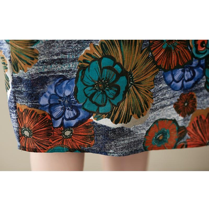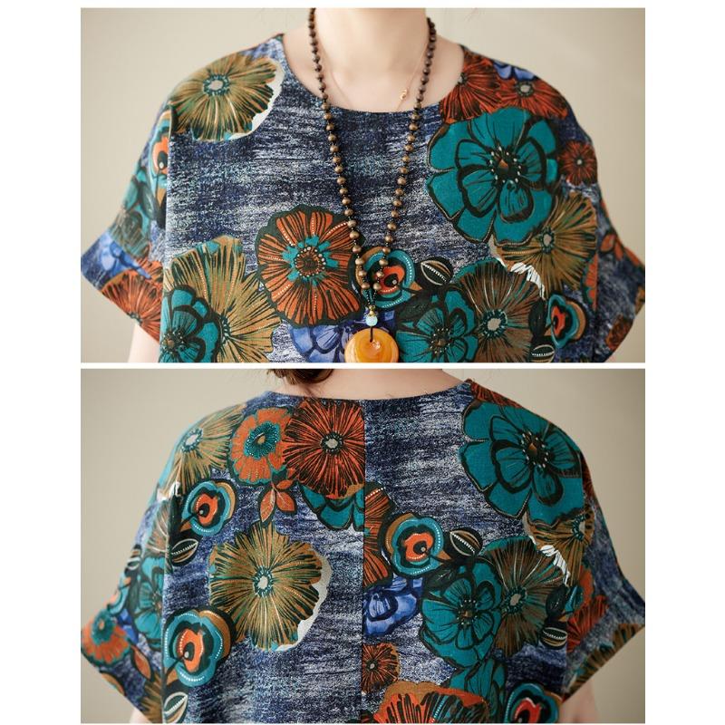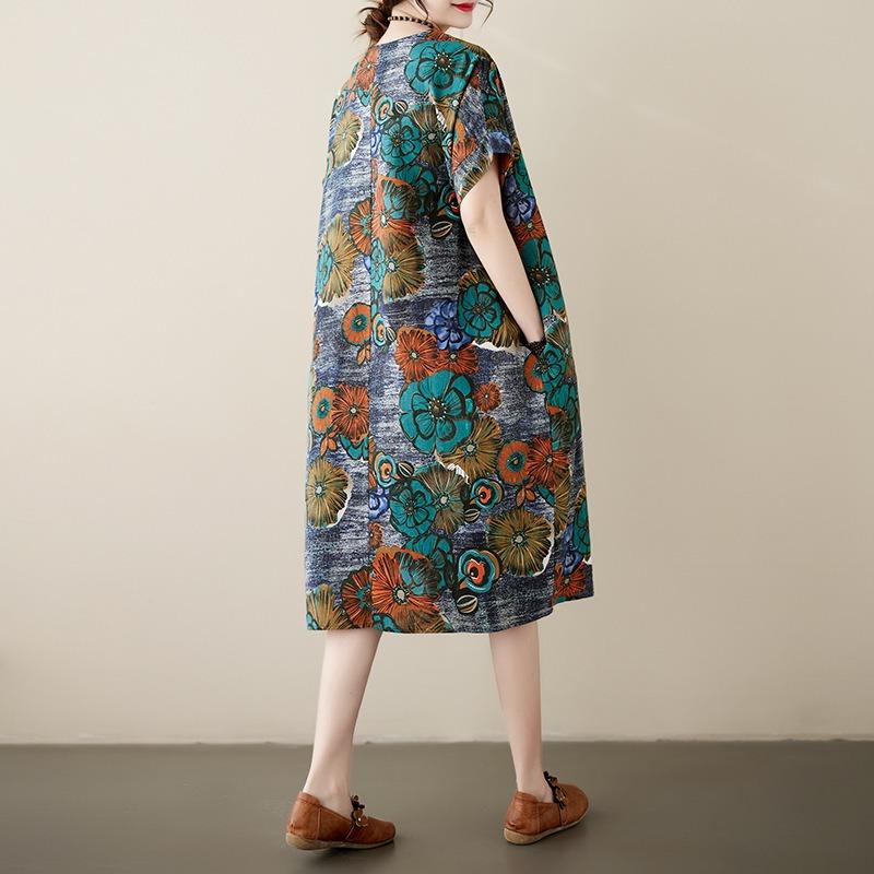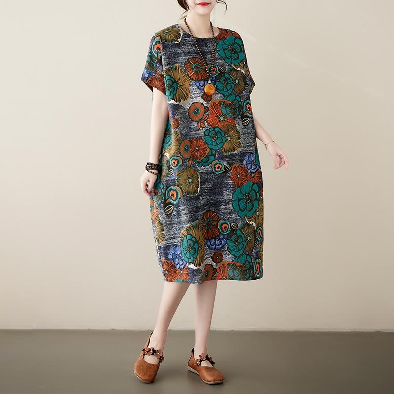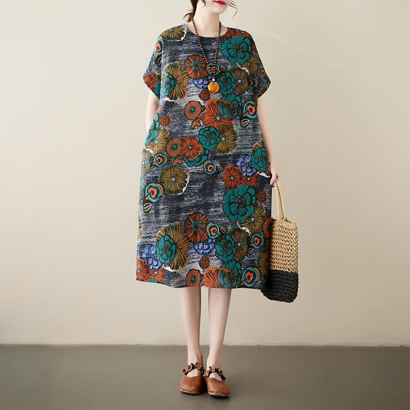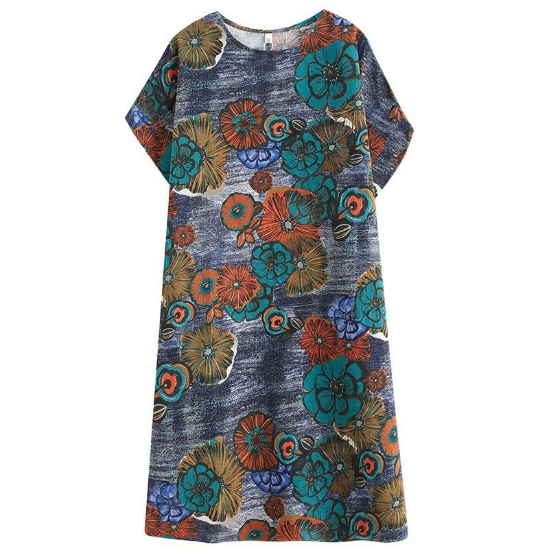 Летнее платье с цветочным принтом длиной до колен из хлопка и льна с принтом в стиле ретро с круглым вырезом и короткими рукавами для женщин