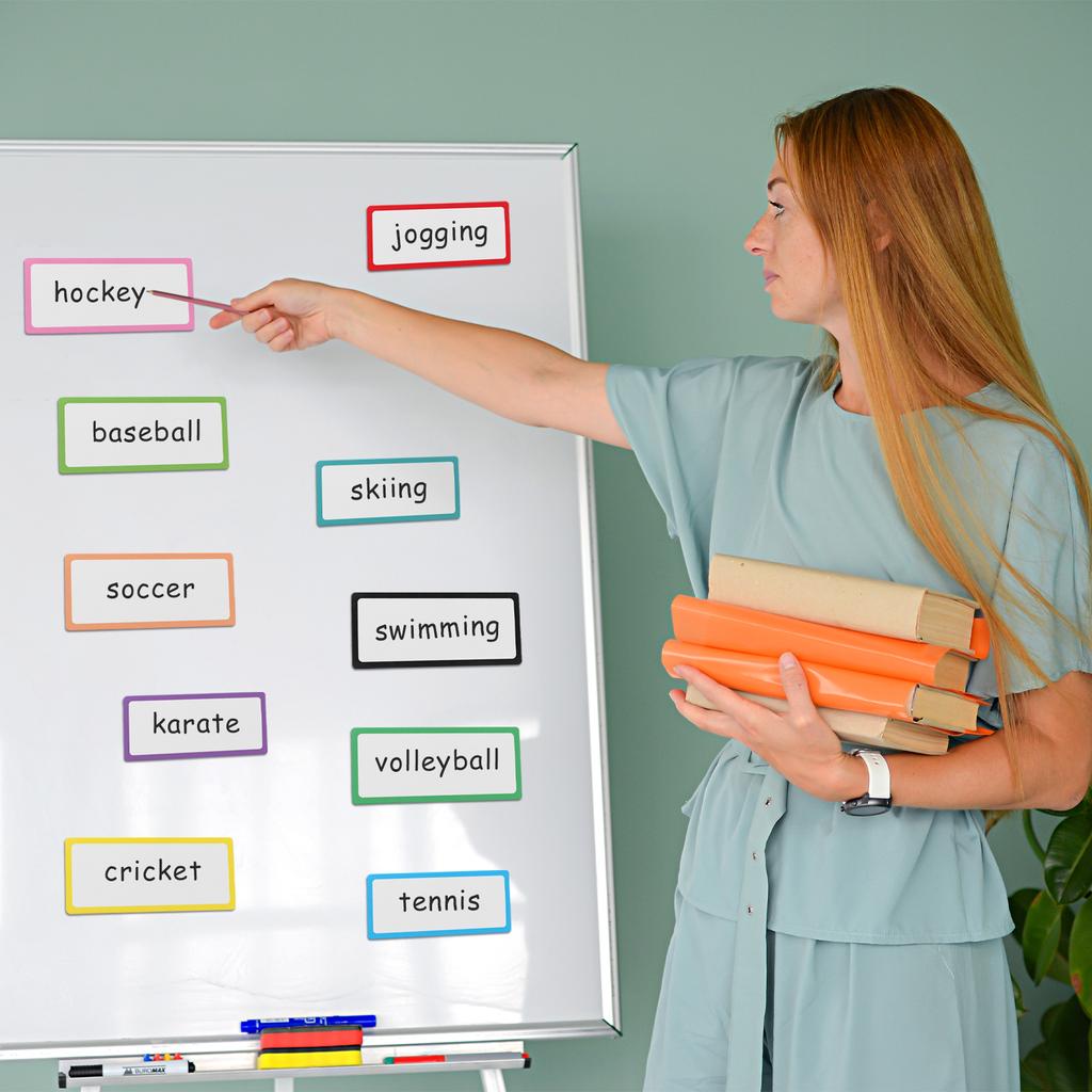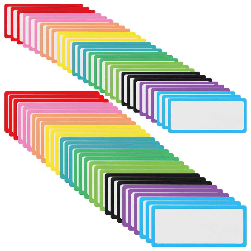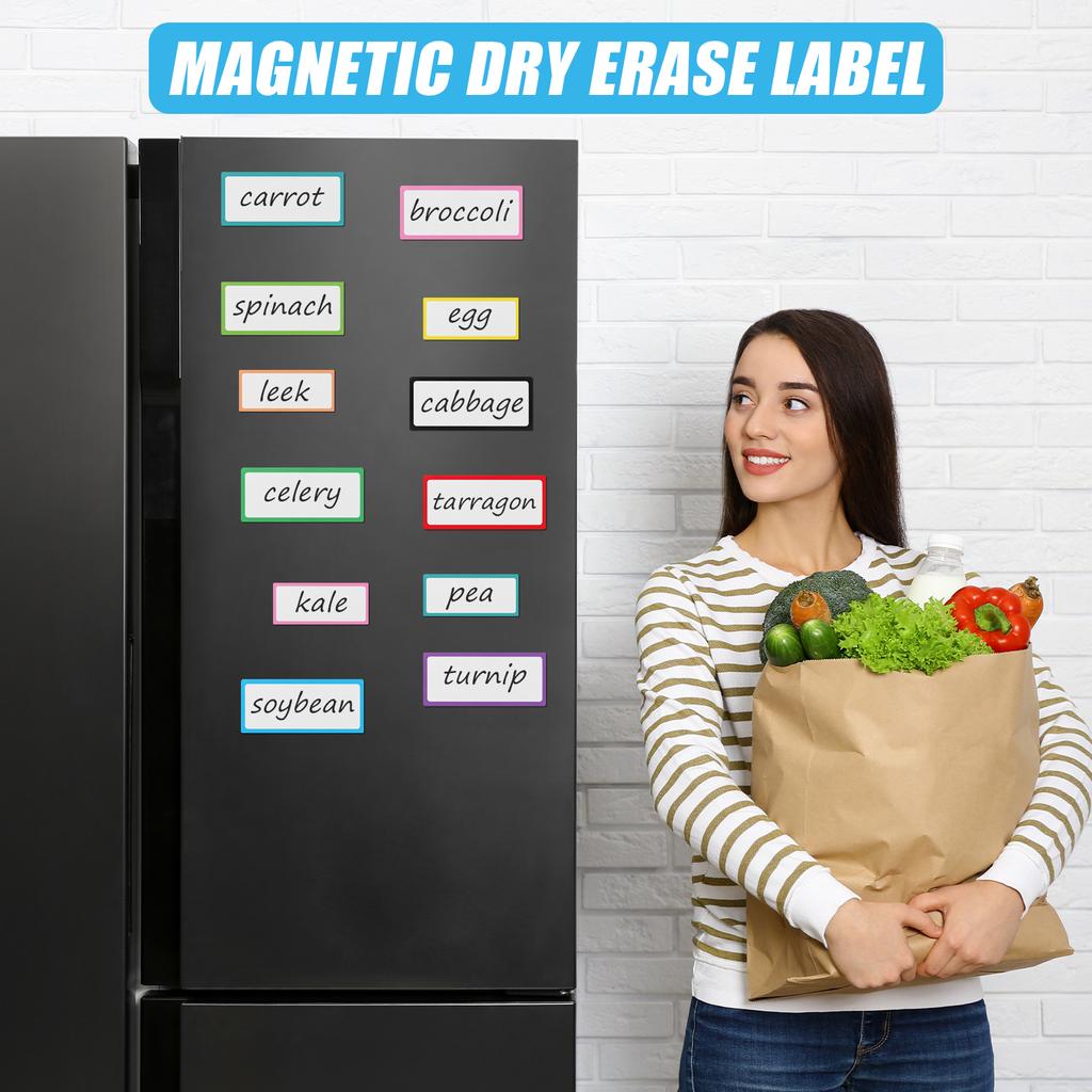 Материал продукта: Магнитные этикетки имеют белую лицевую сторону с цветным краем, изготовлены из ламинированной художественной бумаги, стираемой сухим способом, на которой можно писать, и магнит толщиной 0,04 дюйма на обратной стороне для надежного сцепления с различными поверхностями.