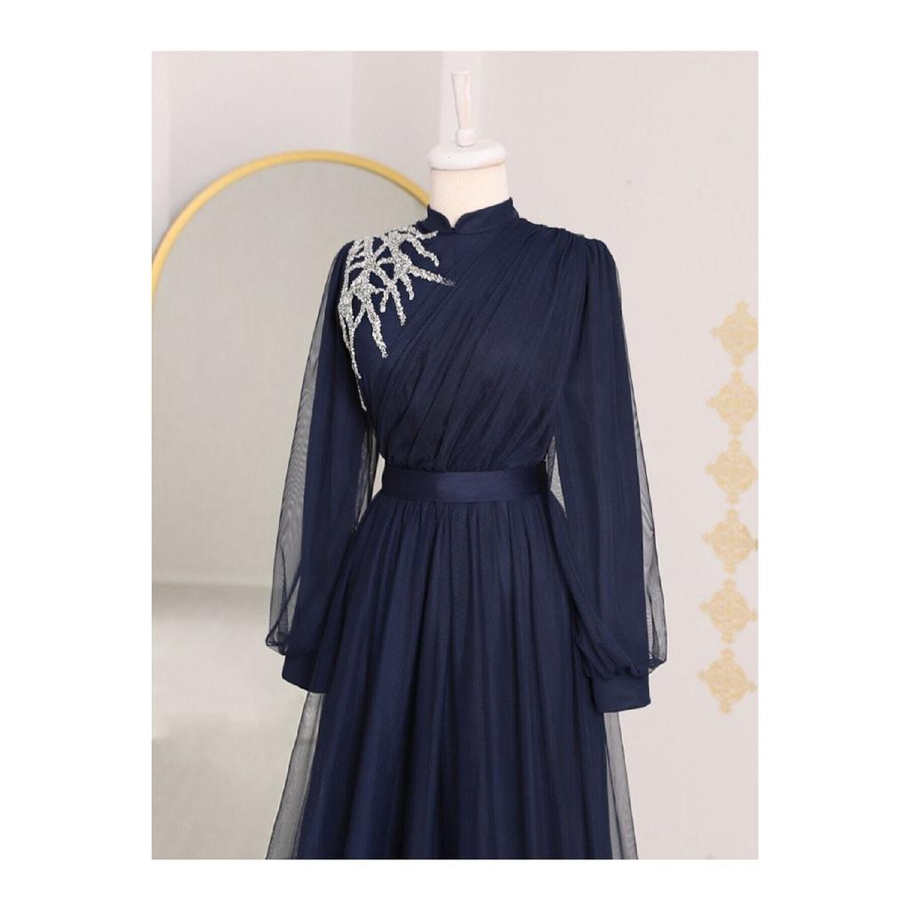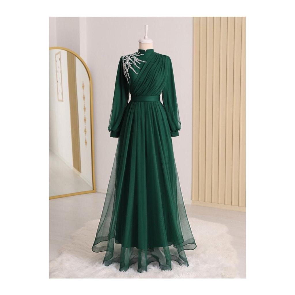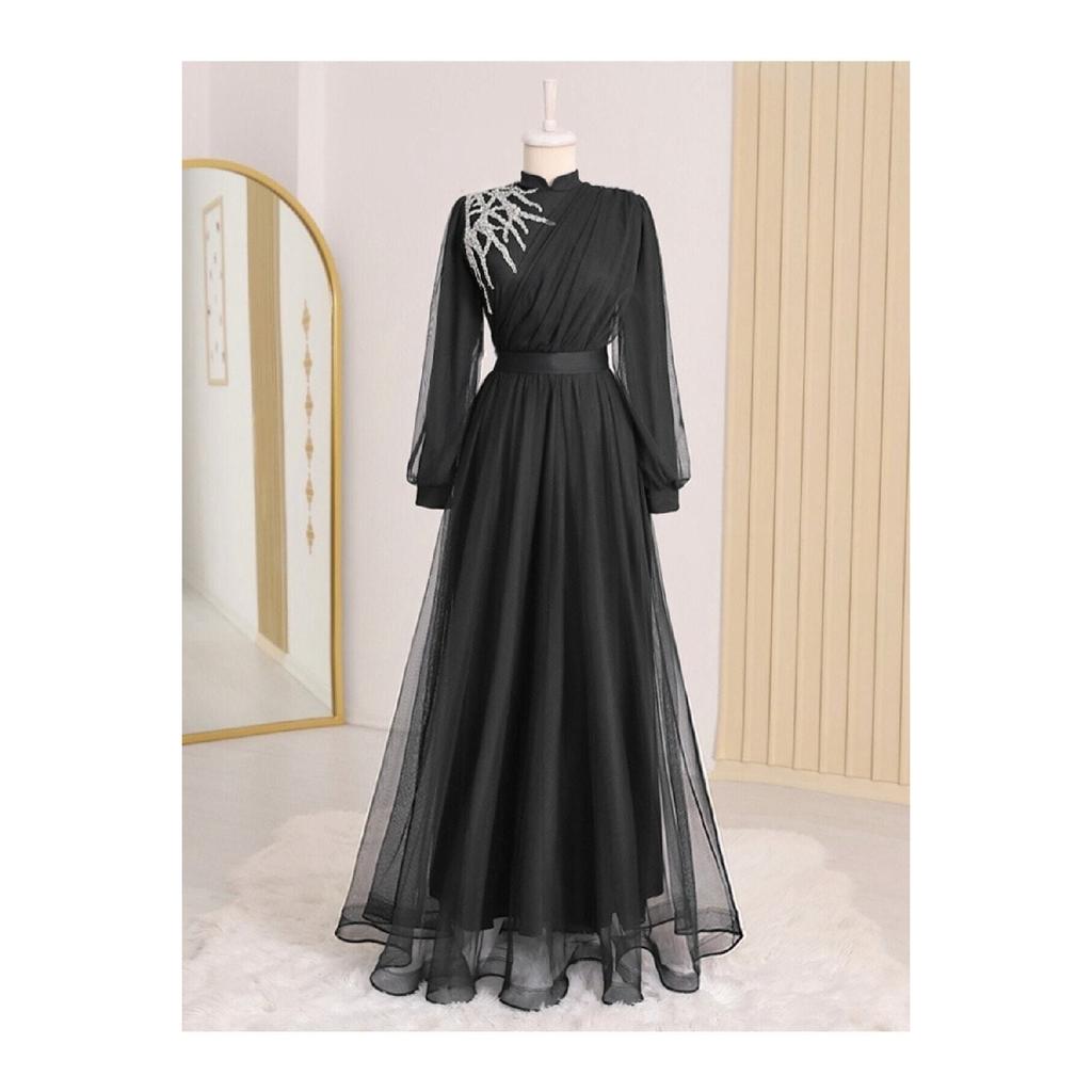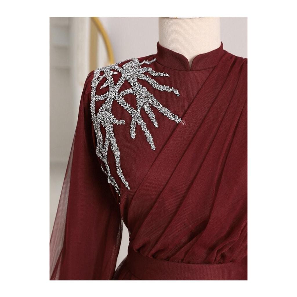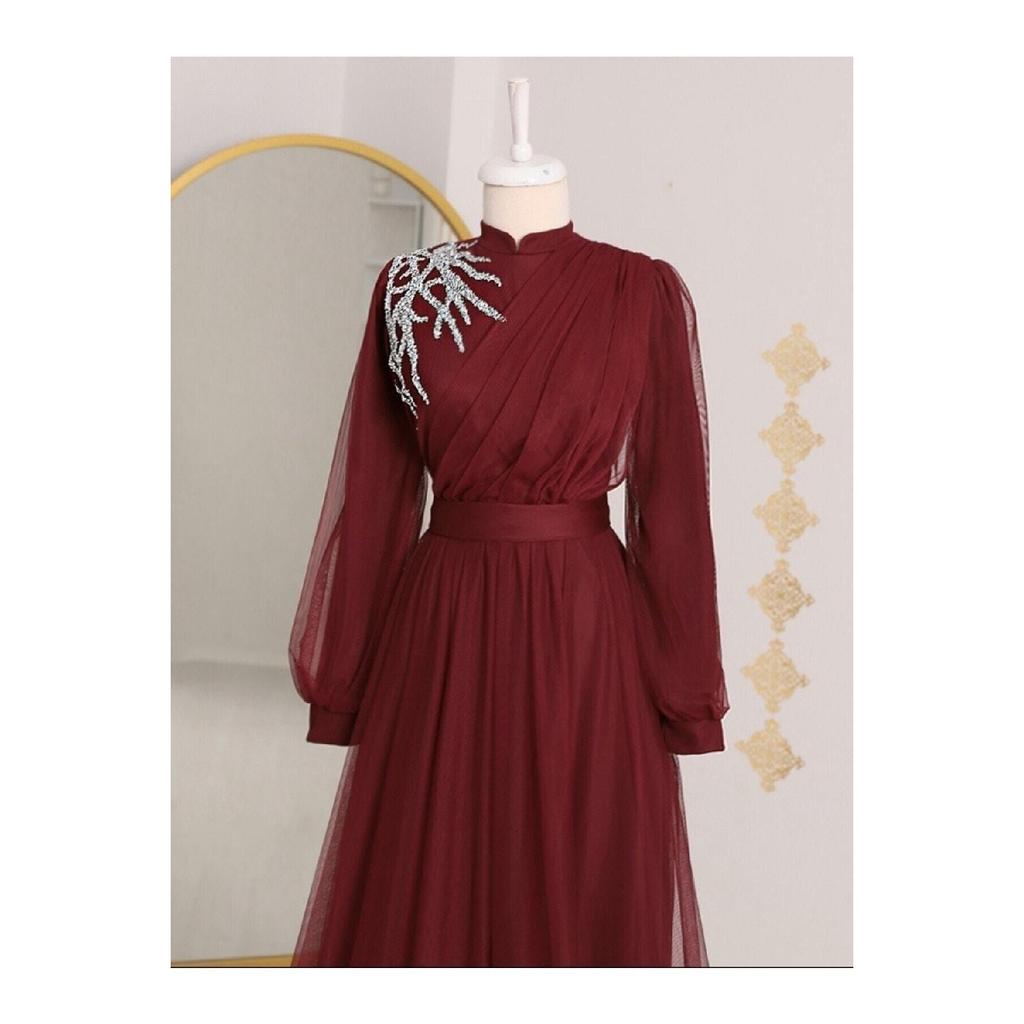 Вечернее платье из тюля с драпировкой и поясом, с каменной отделкой спереди