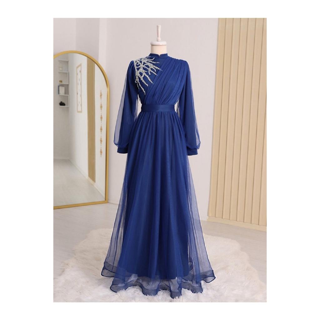 Вечернее платье из тюля с драпировкой и поясом, с каменной отделкой спереди