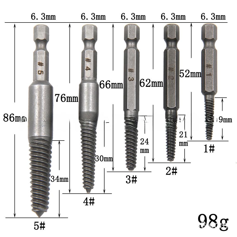 Набор стальных экстракторов для винтов из 5 предметов с шестигранной рукояткой 6,3 мм для удаления поврежденных винтов