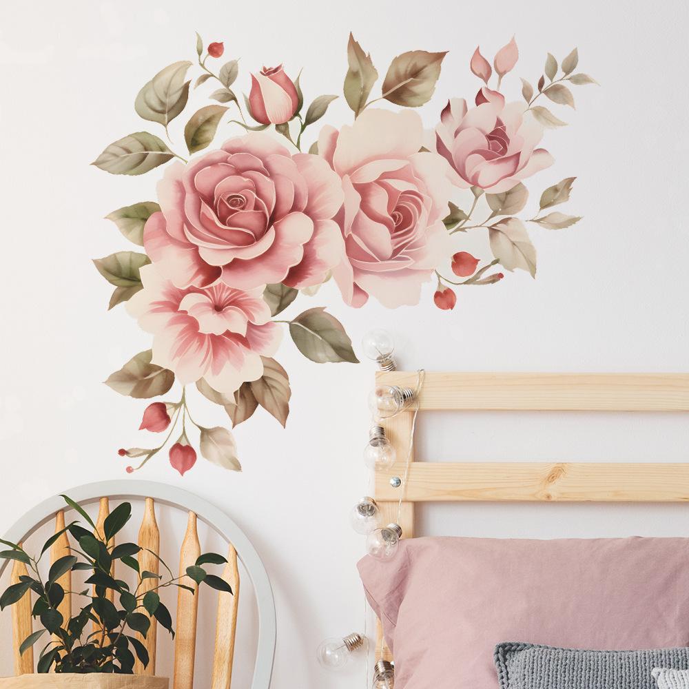 Акварельные розовые романтические розы, листья, изголовье кровати, настенные украшения, наклейки на стену