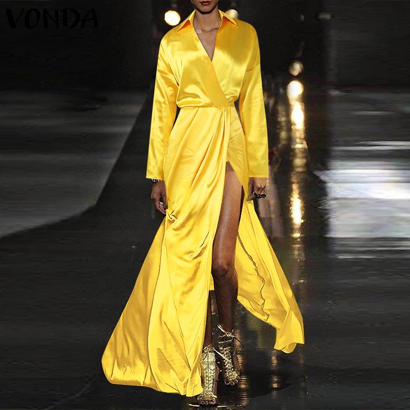 VONDA Женское модное однотонное атласное платье-рубашка с длинными рукавами и разрезом — купить товар онлайн с бесплатной доставкой по всему миру!