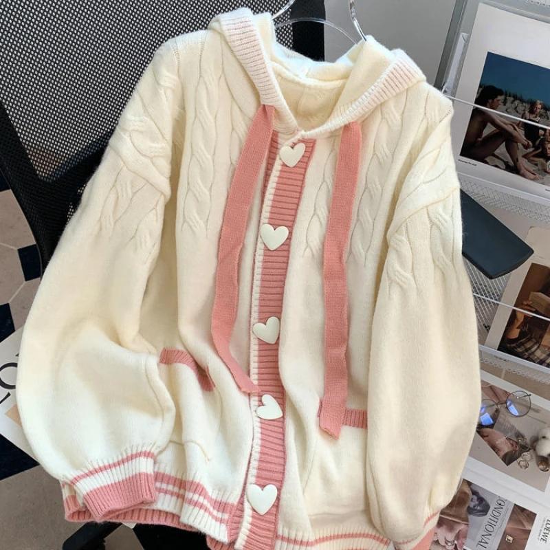 Женский кардиган с пуговицами в форме сердца и капюшоном, осенний узор с нитками, свободные повседневные топы, бежевый контрастный свитер