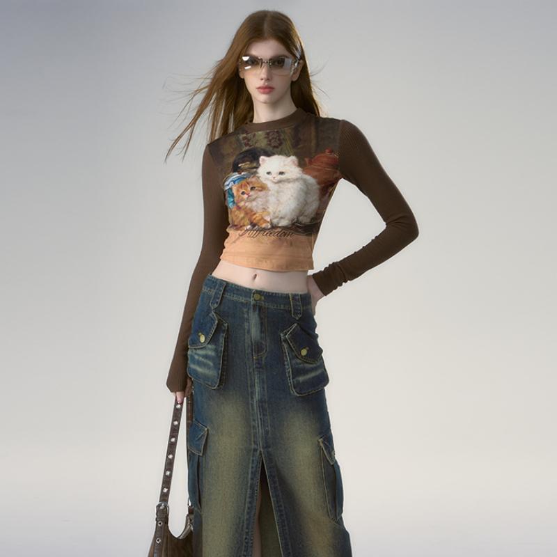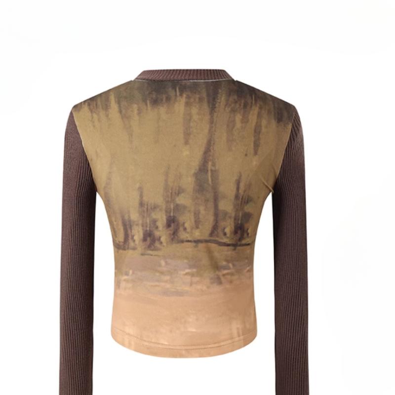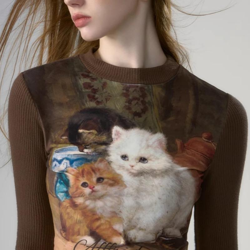 Футболки женские с длинным рукавом, облегающие, с круглым вырезом, с рисунком маслом, в европейском стиле, ретро, винтажные, повседневные, универсальные, модные, шикарные, мягкие