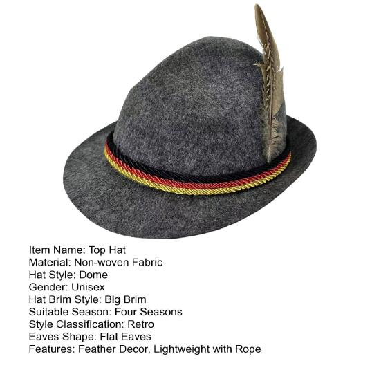 Характеристики: Джазовая шляпа отличается винтажным стилем, декором из перьев и веревок, нетканым материалом, загнутым краем и изысканным шармом.