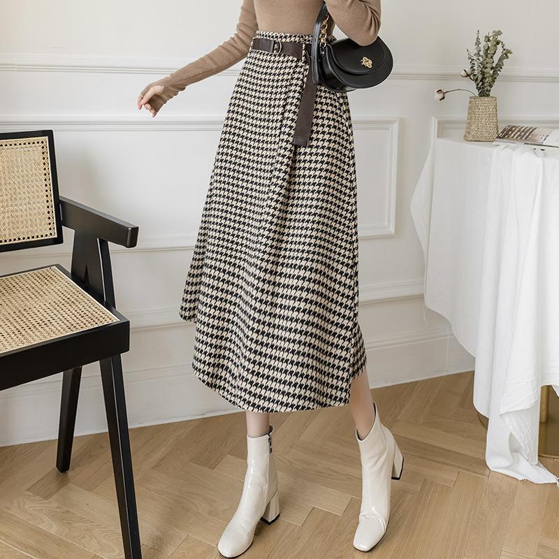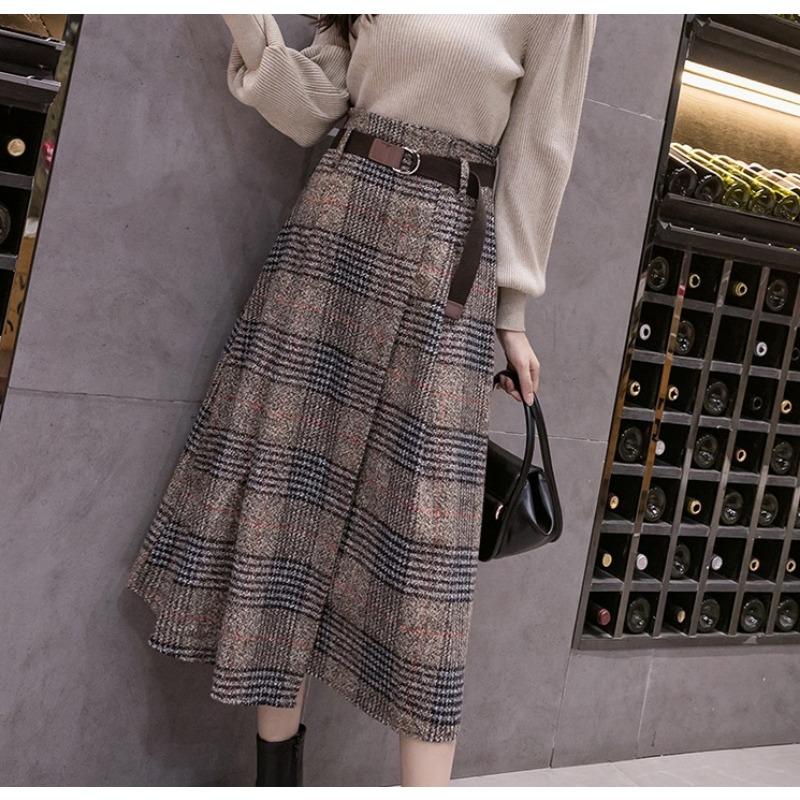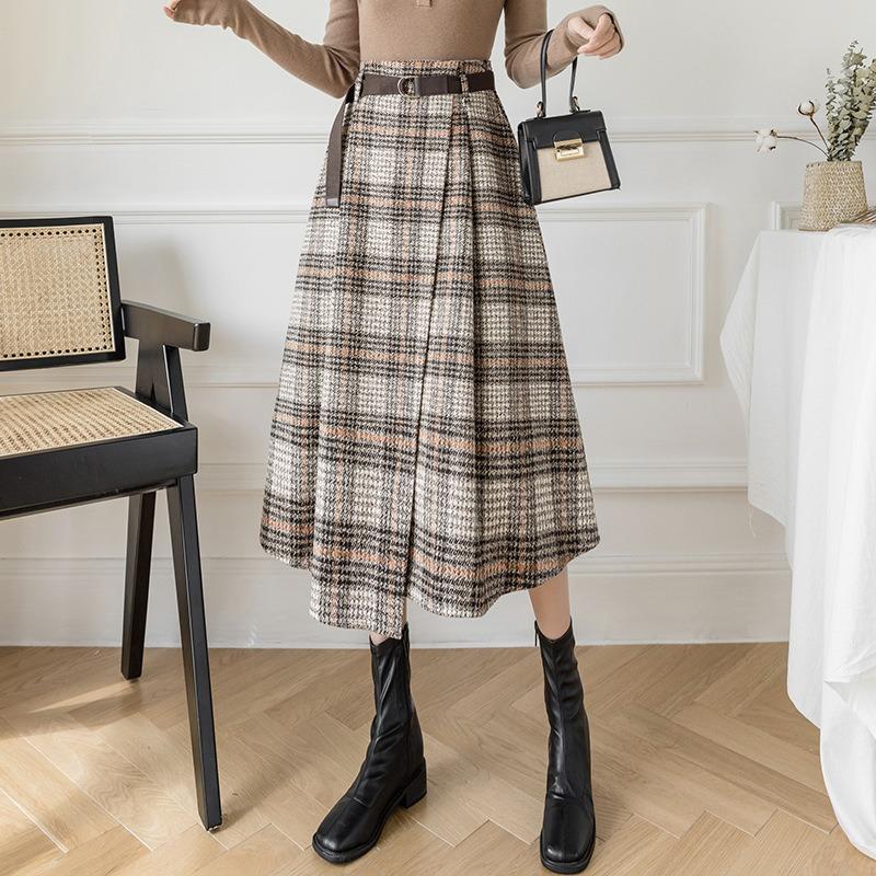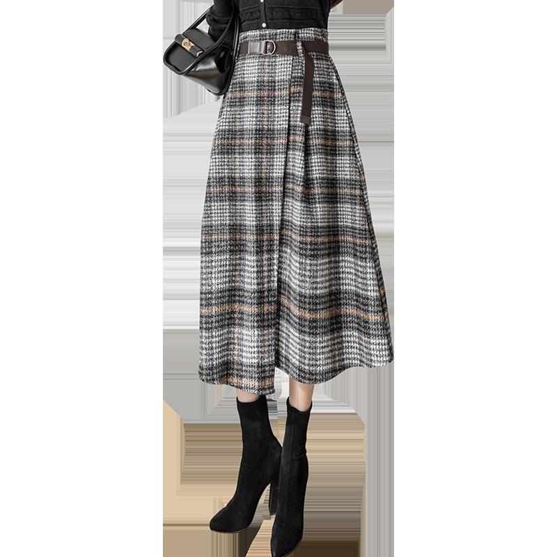 Зимняя ретро клетчатая длинная шерстяная юбка для женщин с высокой талией, утягивающая, нестандартная А-силуэтная юбка большого размера