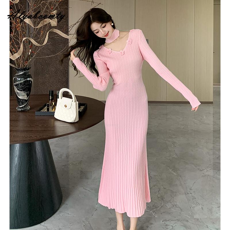 Платье-свитер миди во французском стиле осень-зима розовое черное красное фиолетовое бежевое цветочное трикотажное женственное платье элегантное милое женское трикотажное платье
