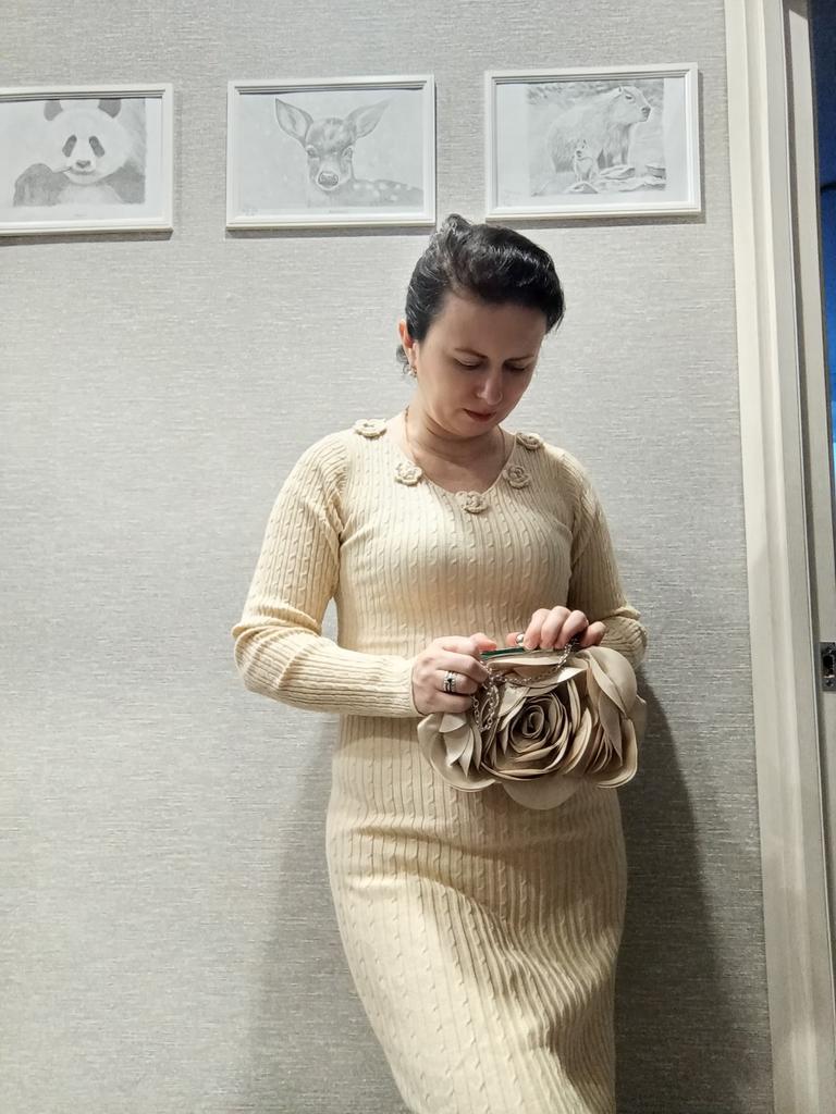Материал платья приятный, мягкий как кашемир. Платье слегка большое подмышками ( у меня ог 86). Единственный недостаток это непонятное отверстие сбоку по шву платья. В Украину заказ пришёл за 16 дней . Платьем довольна 🌸