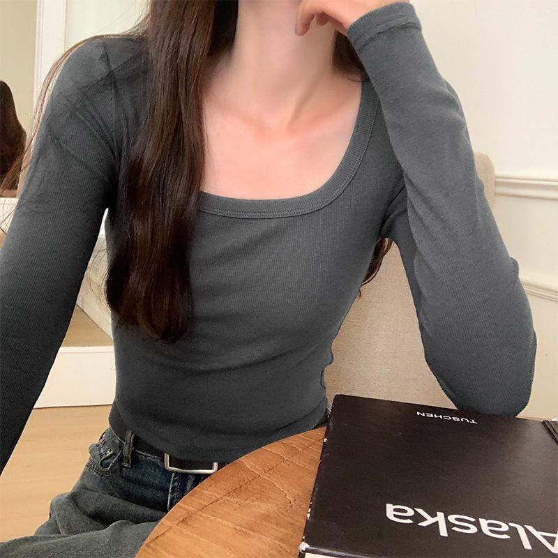Однотонная рубашка с квадратным вырезом для женщин, осень, новая узкая футболка с длинными рукавами, универсальный утягивающий короткий топ