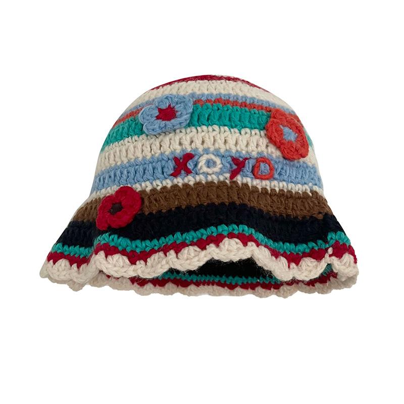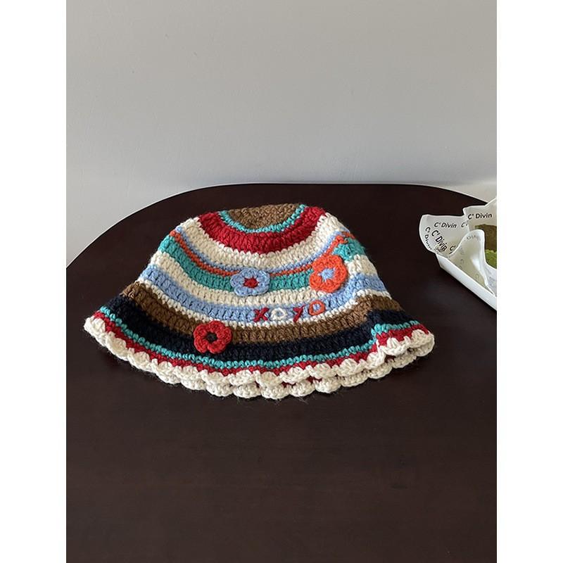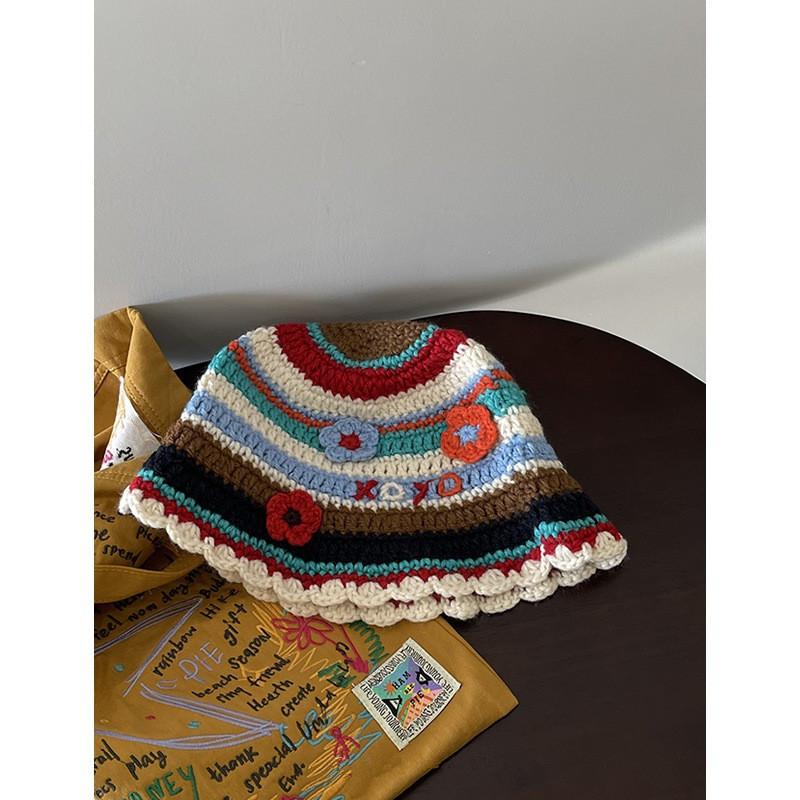 Нишевый дизайн крючком для рук ранняя осень цвет полосатый цветок шерстяная шапка-ведро показывающая лицо маленькая вязаная шапка прилив