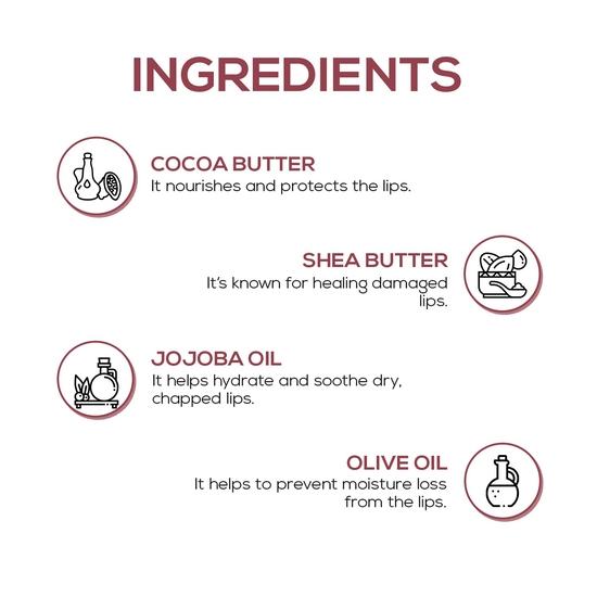 all ingredients: theobroma cacao seed butter, caprylic/capric triglyceride, octyldodecanol, microcrystalline wax, butyrospermum parkii (shea) butter, ricinus communis (castor) seed oil, isopropyl myristate, ci 45410, polyglyceryl-2 triisostearate, olive oil peg-7 esters, jojoba esters, ci 77891 , oryza sativa (rice) bran wax, prunus avium (sweet cherry) seed oil, helianthus annuus (sunflower) seed oil, ci 12085, ascorbyl palmitate, tocopherol, fragrance