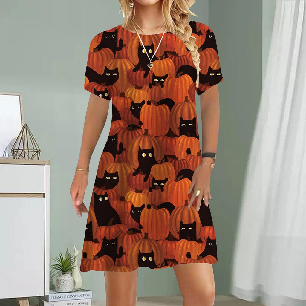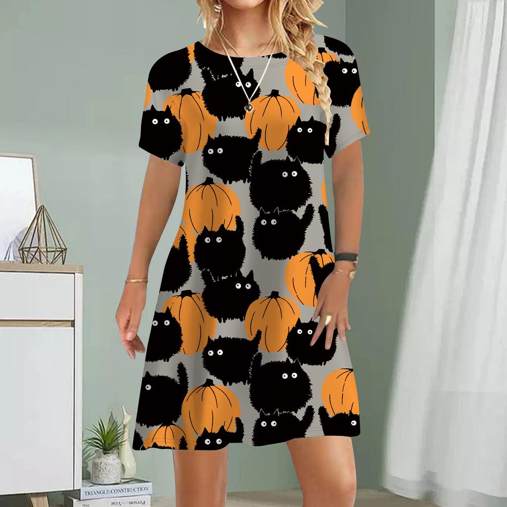 Женское повседневное платье Лето Угольный шар Кошка Принт Платья Для Женщин О-образным Вырезом Короткие Рукава Платье Плюс Размер