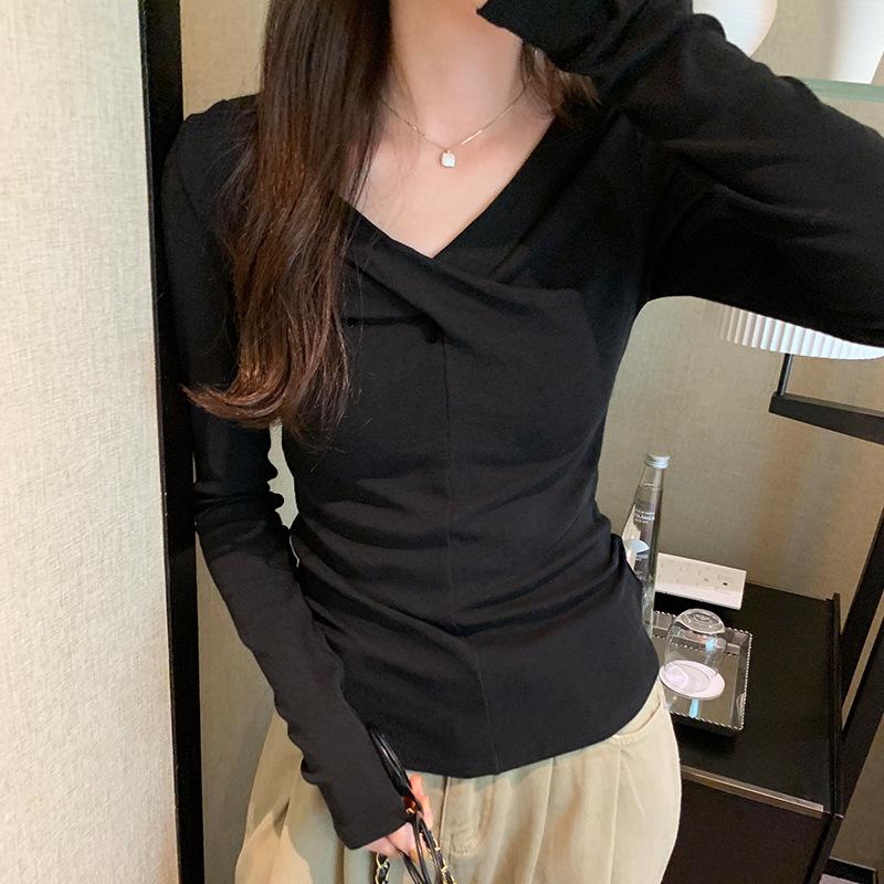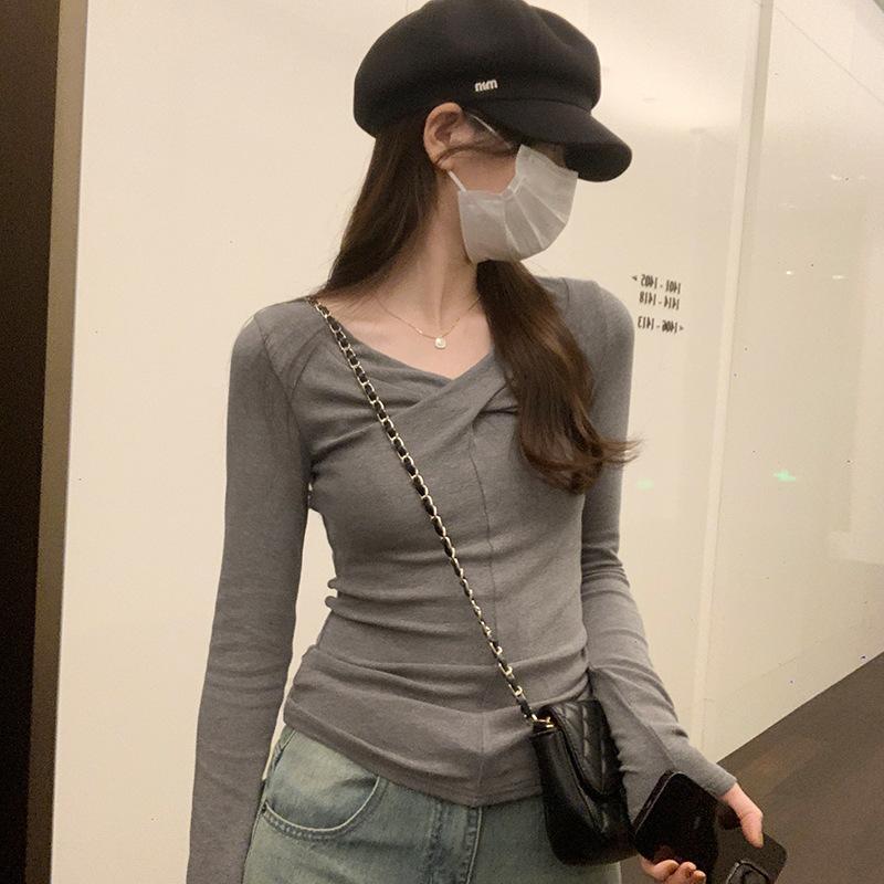 Европейская маленькая рубашка розовая футболка с крестом и V-образным вырезом женская осенне-зимняя новая универсальная шикарная тонкая майка с длинными рукавами