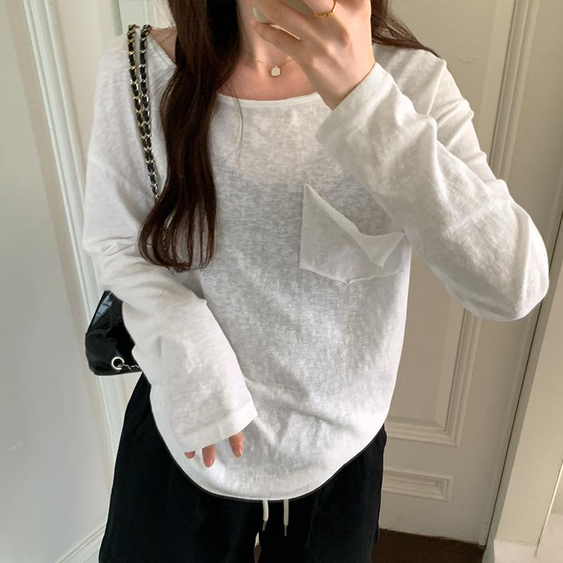 Белый свободный топ с длинными рукавами и U-образным вырезом для женщин на осень, новая сексуальная слегка прозрачная блузка с нижней рубашкой