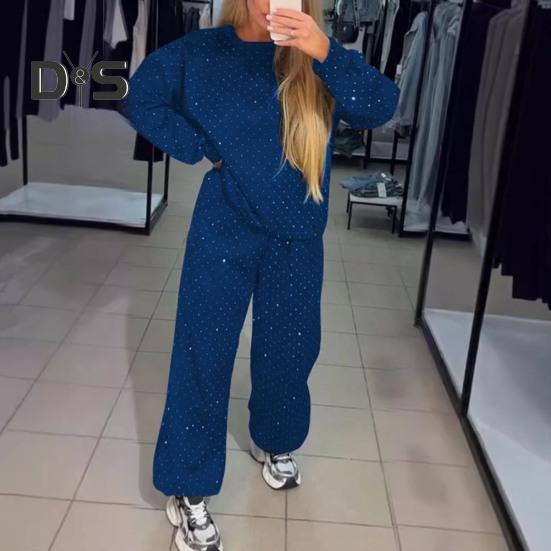 Элегантный и универсальный, этот женский костюм станет обязательным дополнением к вашему гардеробу.. Свободный крой обеспечивает одновременно стиль и комфорт, что делает его идеальным для различных случаев.. Этот костюм-двойка, изготовленный из дышащей полиэфирной ткани, отличается однотонным дизайном и украшен стразами для придания нотки гламура.. Независимо от того, носите ли вы его с повседневной обувью или кроссовками, этот костюм легко сочетает в себе комфорт и шикарный стиль..