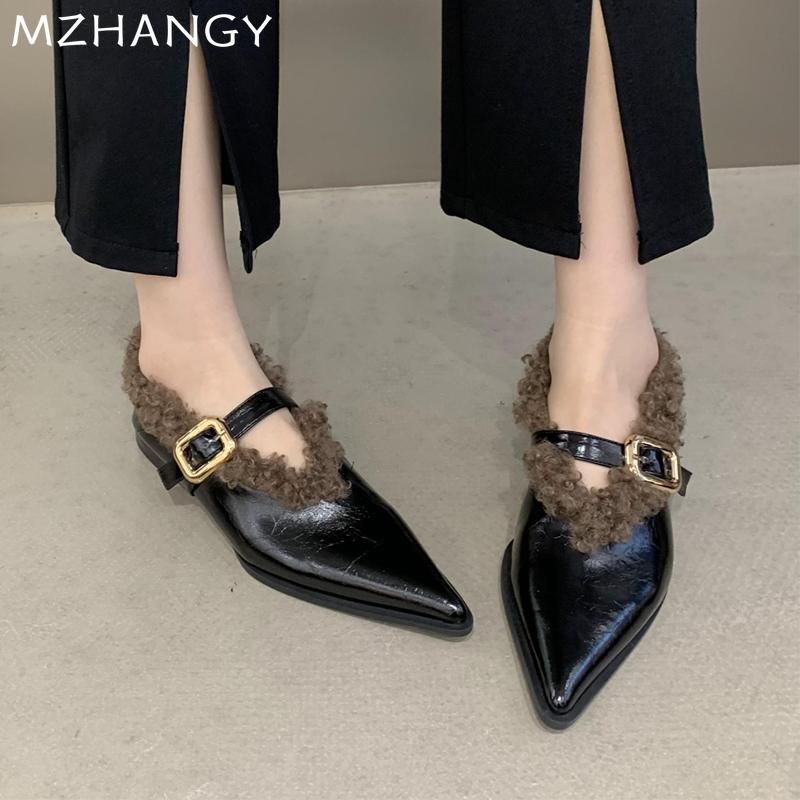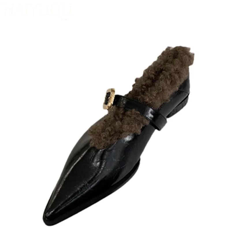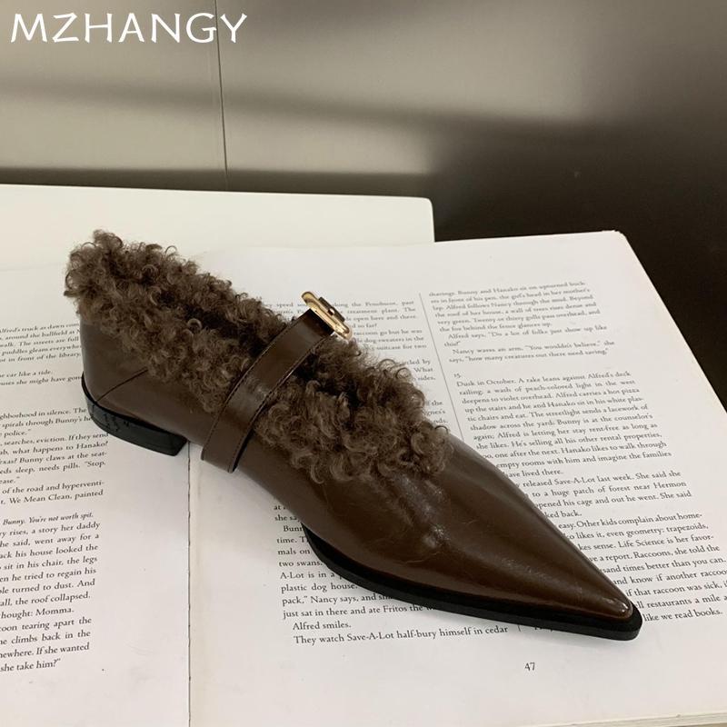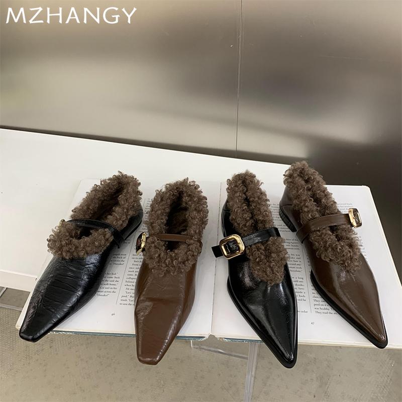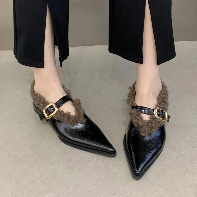 Мода остроносые женские меховые туфли на плоской подошве повседневные теплые туфли женские 2024 тренд мода новые зимние сапоги зимние уютные готические женские ботинки