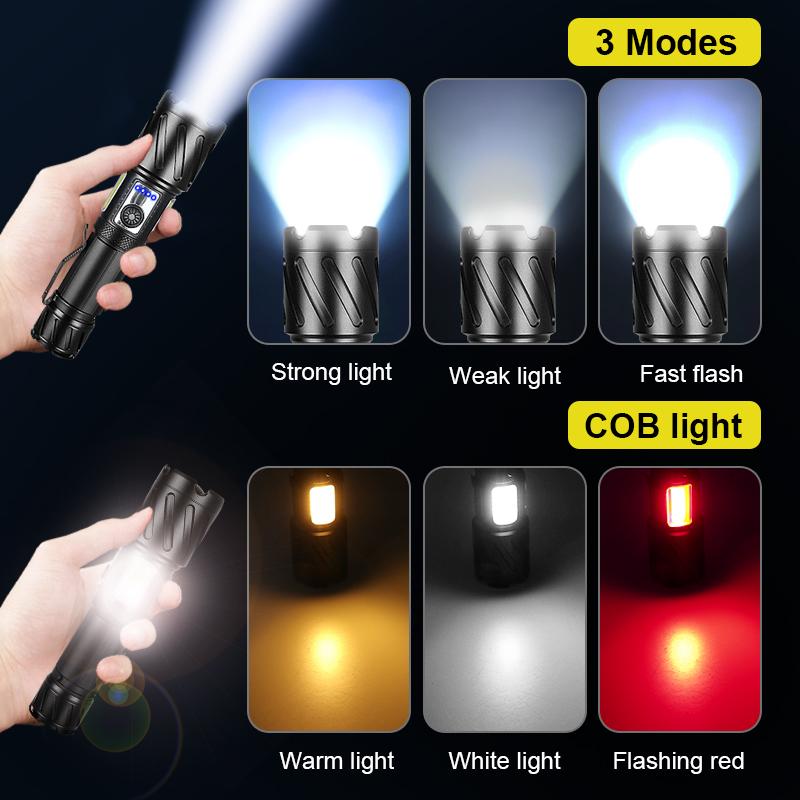 【Применимые сцены】Мощный светодиодный фонарик идеально подходит для дома или кемпинга, пеших прогулок, рыбалки, бега, выгула собак, перебоев в подаче электроэнергии, чрезвычайных ситуаций.. Свет COB подходит для настольной лампы, ночной рыбалки, заполняющего света для фотографий, сигнала бедствия и других мест.