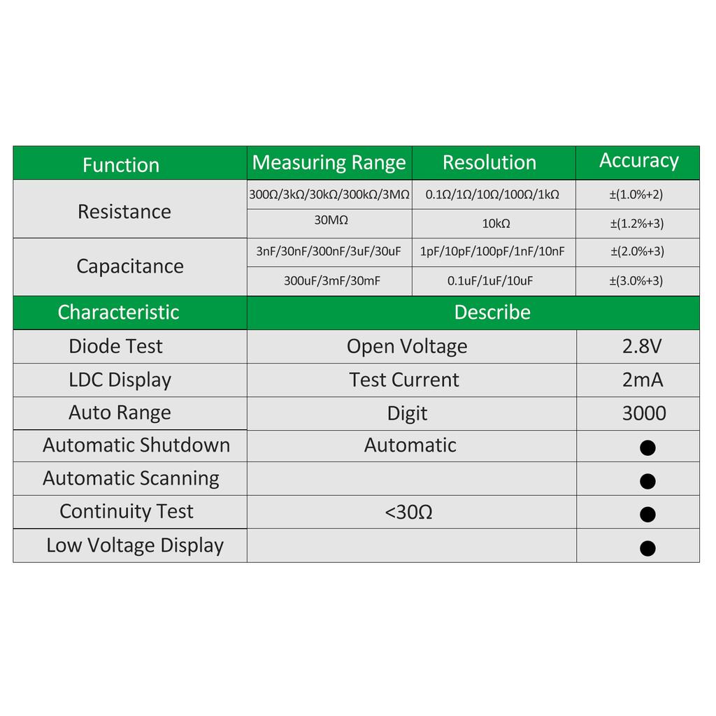 Функция множественного тестирования: он специально используется для измерения SMD(Устройство поверхностного монтажа(, включая режим сканирования, измерение сопротивления, измерение емкости, проверку диодов, проверку целостности цепи. \F\ одна кнопка для выбора функции.