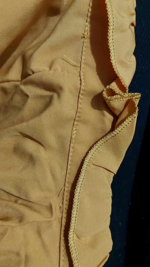 Ткань оказалась плотной синтетикой , поэтому сидит совершенно ни так , как на картинке продавца. Цвет тоже не соответствует изображению. Это не ярко-жёлтый , а грязно-оранжевый цвет. Пошив жутко небрежный! Стянутые швы , кривые швы ; детали , пришитые не ровно ; и такое множество торчащих ниток , которое мне ещё нигде не попадалось!