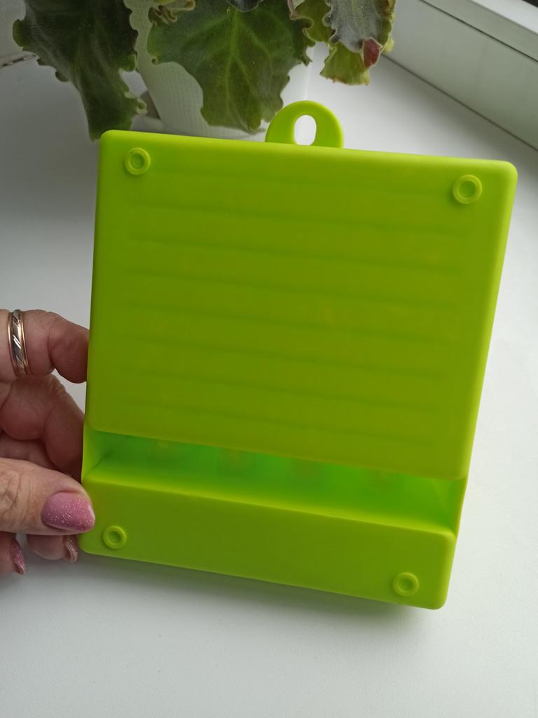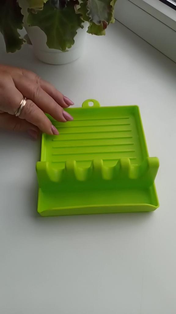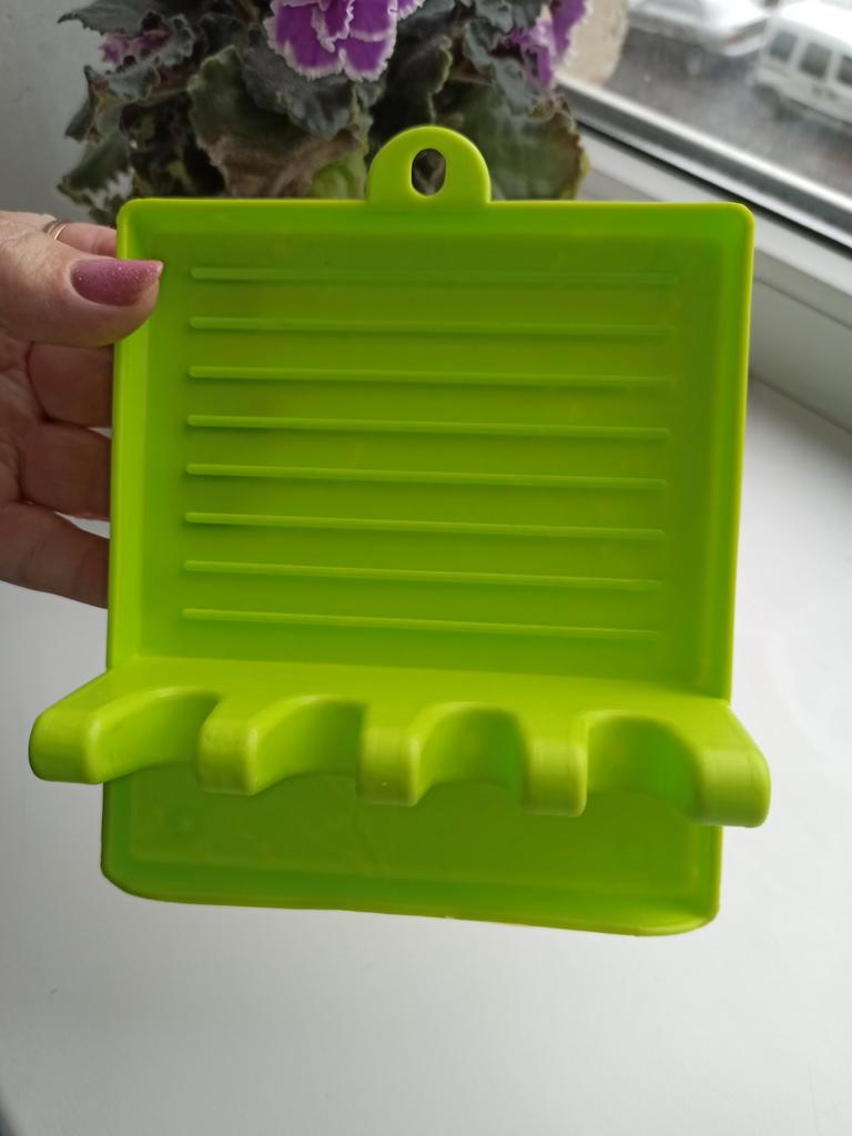 Подставка для кухонных приборов Изготовлена из плотного пластика, качественно, размер 17*12,5*4,5 см. Без запаха. На подставке имеется пителька, очень удобно при хранении. С изнаночной стороны есть антискользящие ножки, подставка хорошо стоит на столе и не скользит. Подставка очень удобная ,так как имеет деления,и столовые приборы лежат по отдельности. Крышки можно ставить как маленького диаметра так и побольше,держатся хорошо. С такой подставкой на вашей кухне всегда будет порядок. Рекомендую товар и продавца.