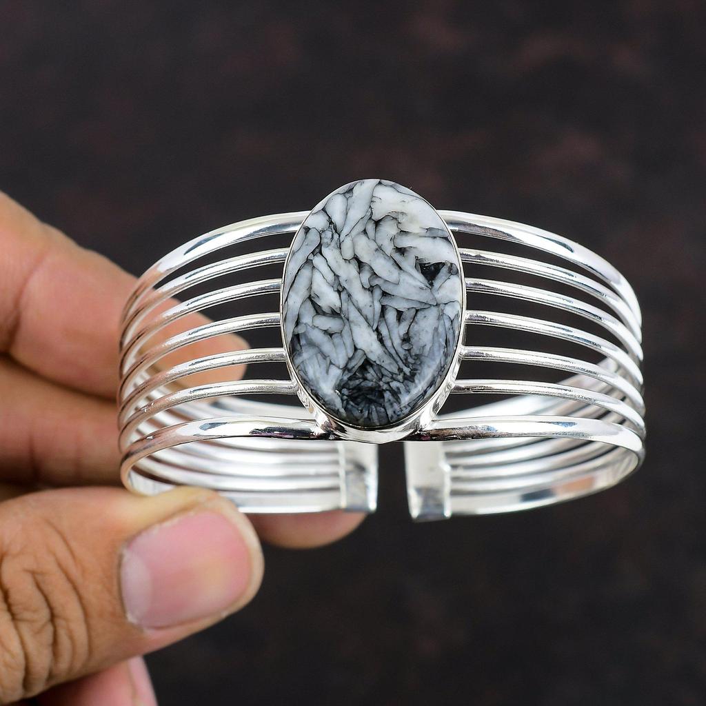 Браслет-манжета Pinolith Jasper из стерлингового серебра 925 пробы, регулируемый браслет-манжета ручной работы с настоящим драгоценным камнем, изящный браслет-манжета, подарок на годовщину