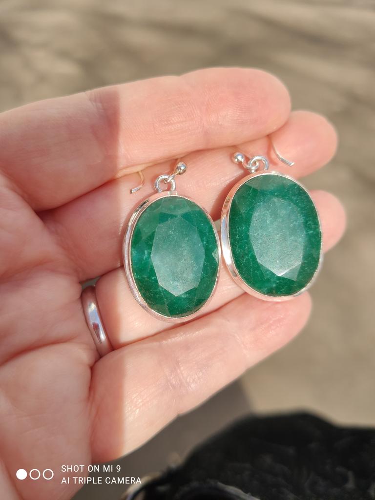 Серьги шикарные, крупные, насыщенного зеленого цвета камни, оправа простая, но к таким камням подходит. Я считаю, что камни - это фиксированный изумруд, он не прозрачный, но все равно камень драгоценный. Проба 925 стоит на оправе. Правда застежка совсем простая петля, стоит, наверное, ее заменить.