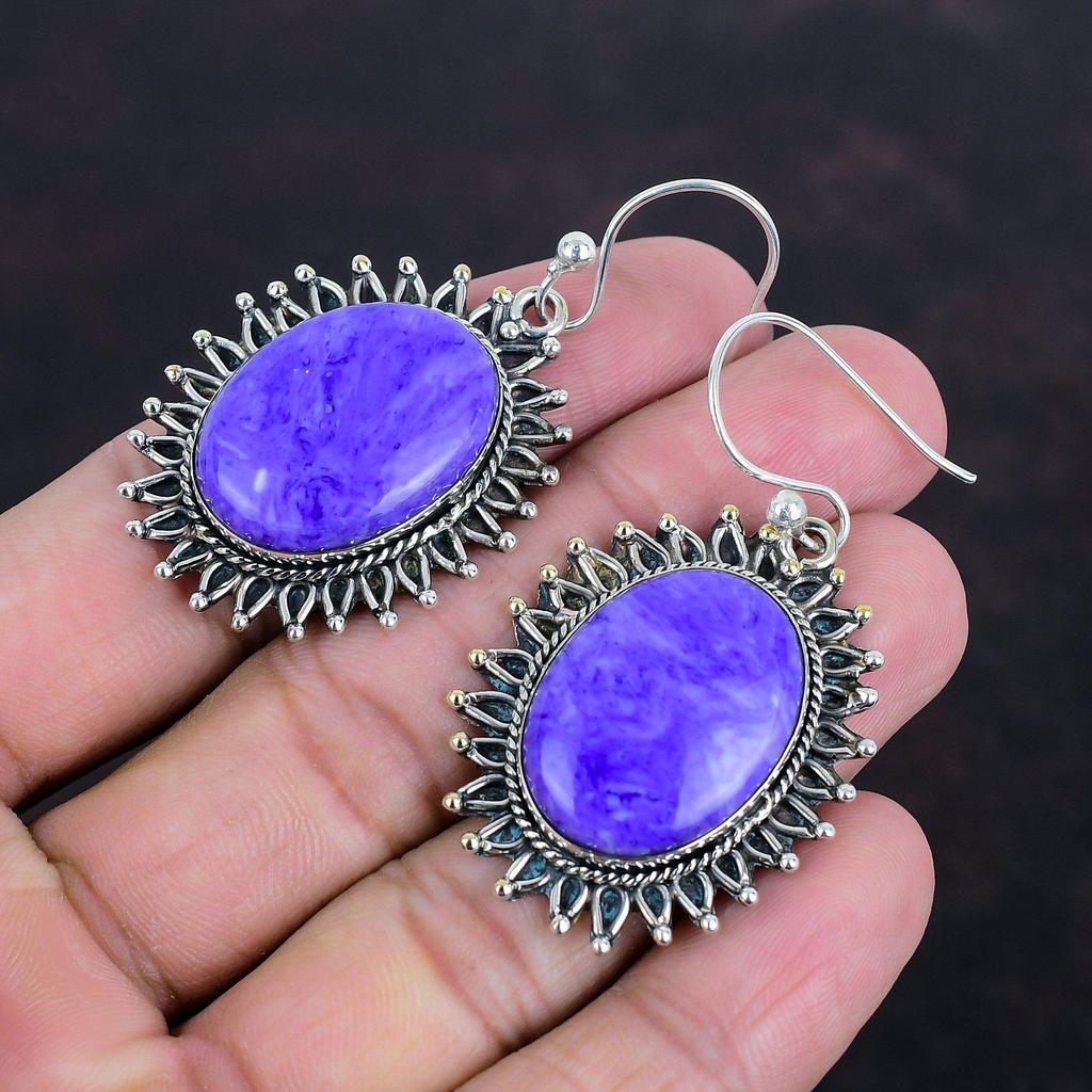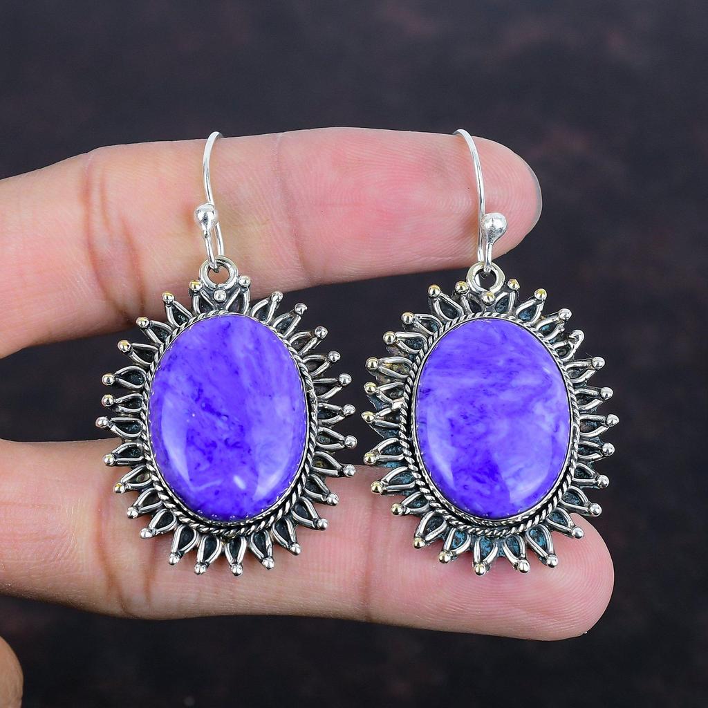 Серьги с драгоценными камнями чароит, ювелирные изделия ручной работы, серьги из стерлингового серебра 925 пробы, оригинальные ювелирные изделия с чароитом, потрясающие висячие серьги, подарки на годовщину