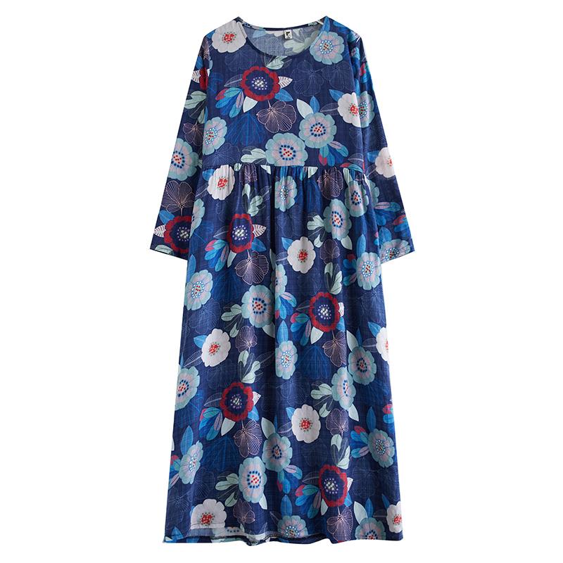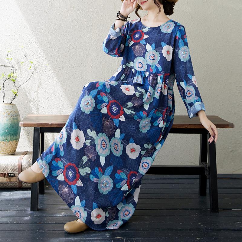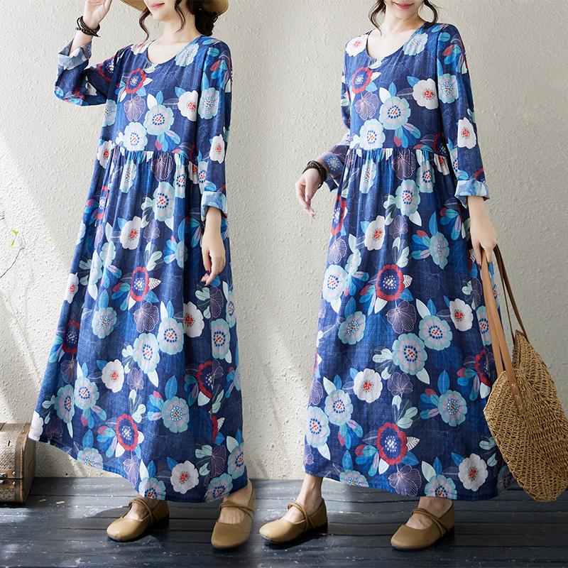 DIMANAF 2024 Новое женское осеннее платье больших размеров с цветочным принтом Длинное платье с длинным рукавом и круглым вырезом Винтажная одежда