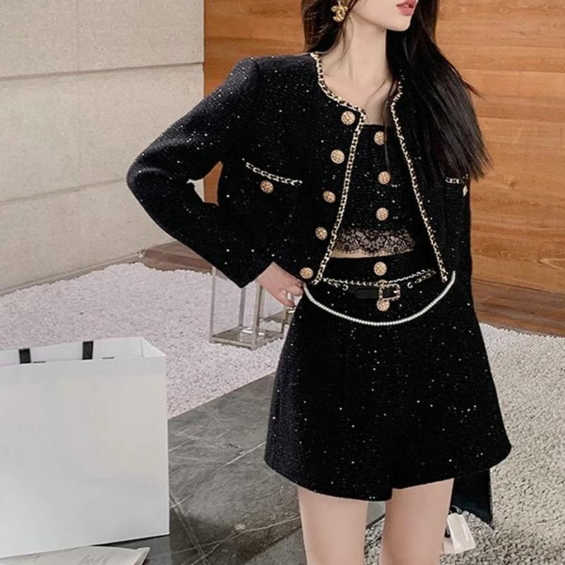 Костюм в ароматном стиле для женщин, новые аксессуары для волос на осень и зиму, женственное темпераментное короткое пальто, майка, широкие шорты, комплект из трех предметов
