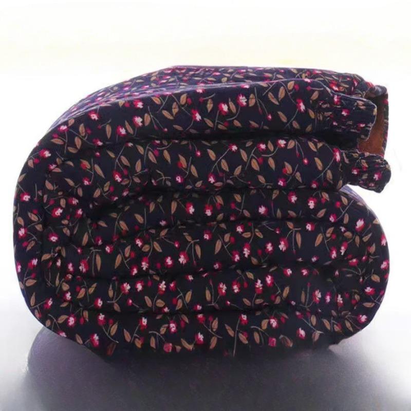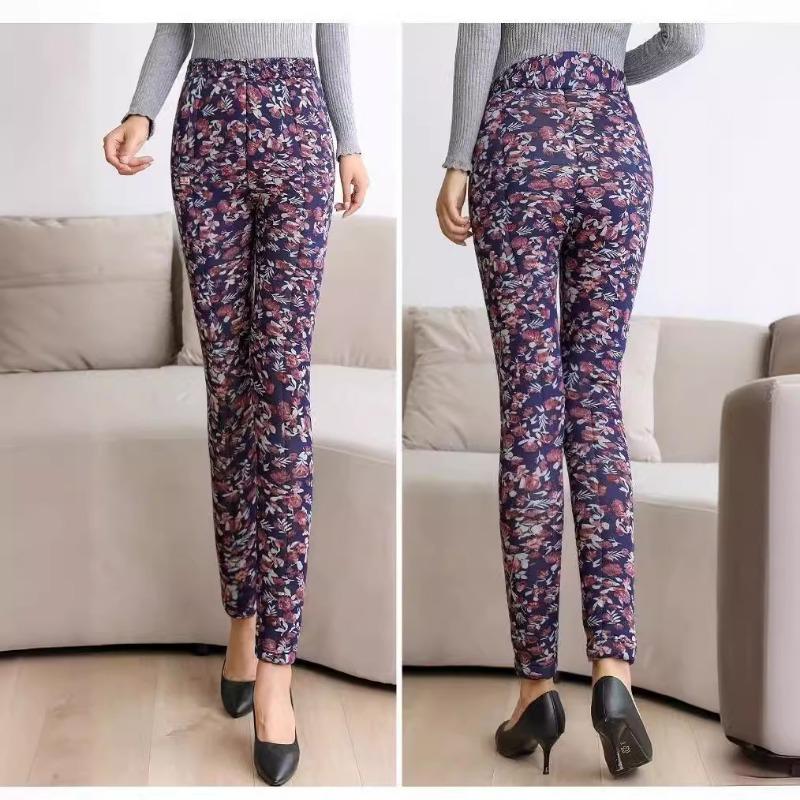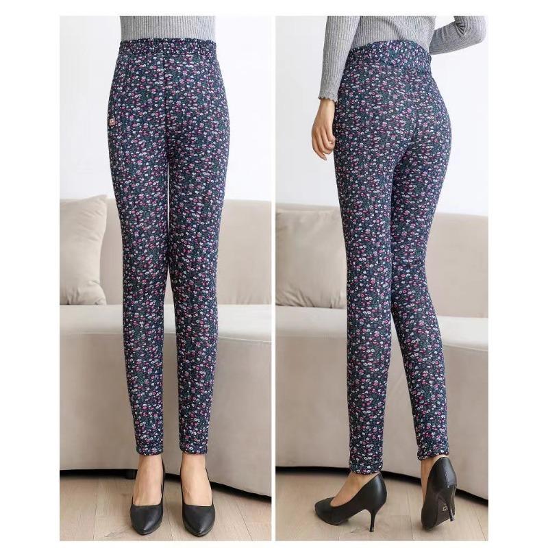 Повседневные брюки из хлопка с высокой талией для пожилых женщин, осенне-зимние теплые толстые узкие брюки с винтажным цветочным принтом
