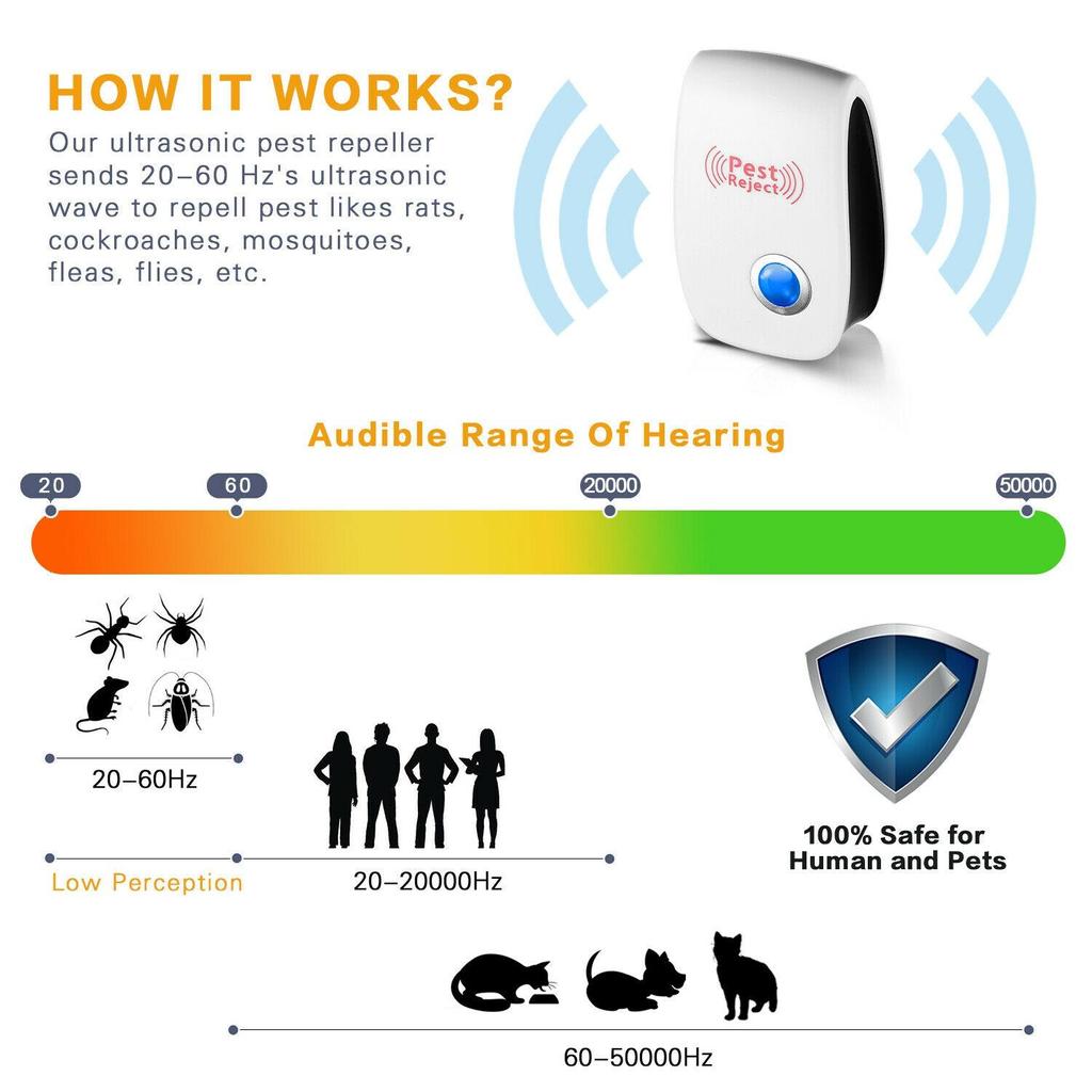 УЛЬТРАЗВУКОВАЯ ТЕХНОЛОГИЯ: Этот ультразвуковой отпугиватель вредителей является последней версией и использует более мощный модернизированный чип, который затрудняет иммунизацию вредителей и грызунов, чем раньше.. Производят хорошее вредное воздействие на мышь, таракана, паука, комаров, насекомое, крысу, грызуна, мух, муравья, блох и других вредителей.