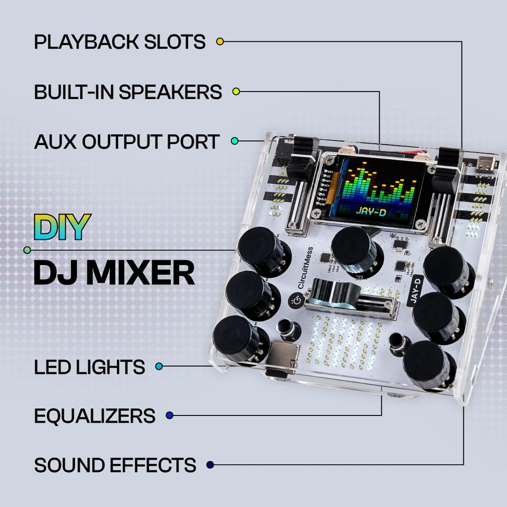 Jay-D is a DIY DJ Console that puts you in control of the music. Learn how to assemble this feature-packed device while exploring sound mixing, audio effects, and more. Once built, Jay-D allows you to: