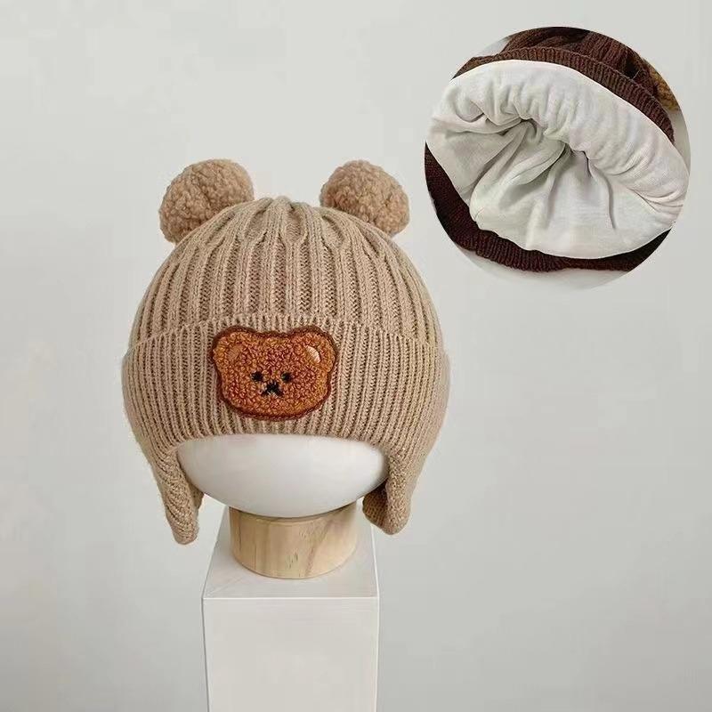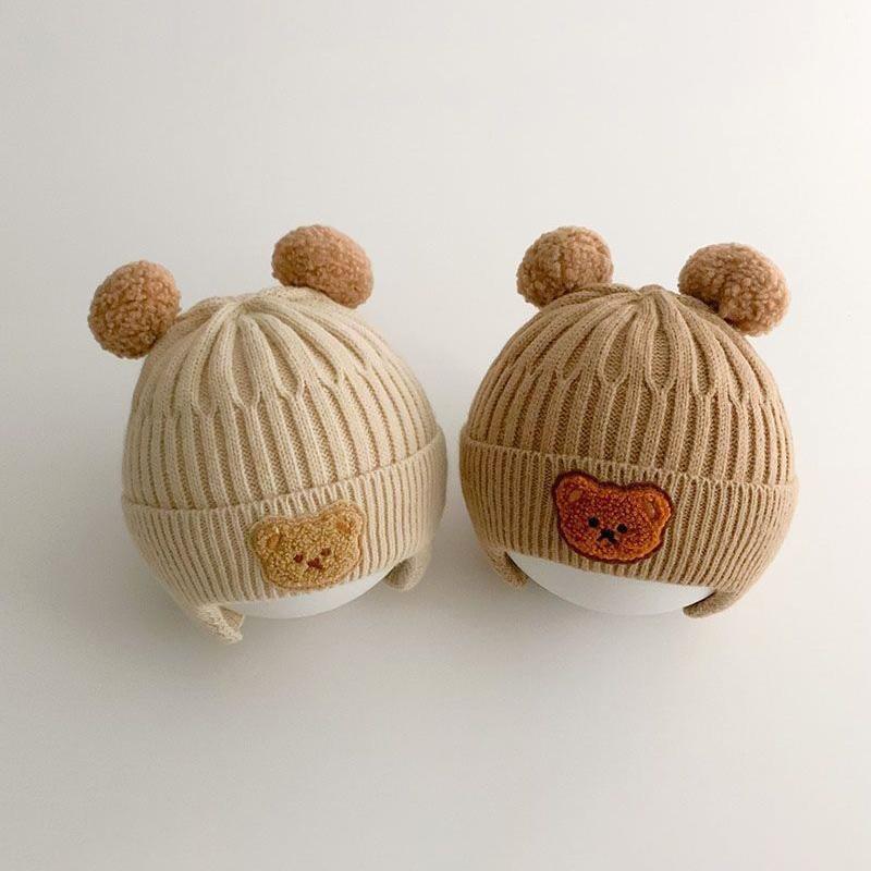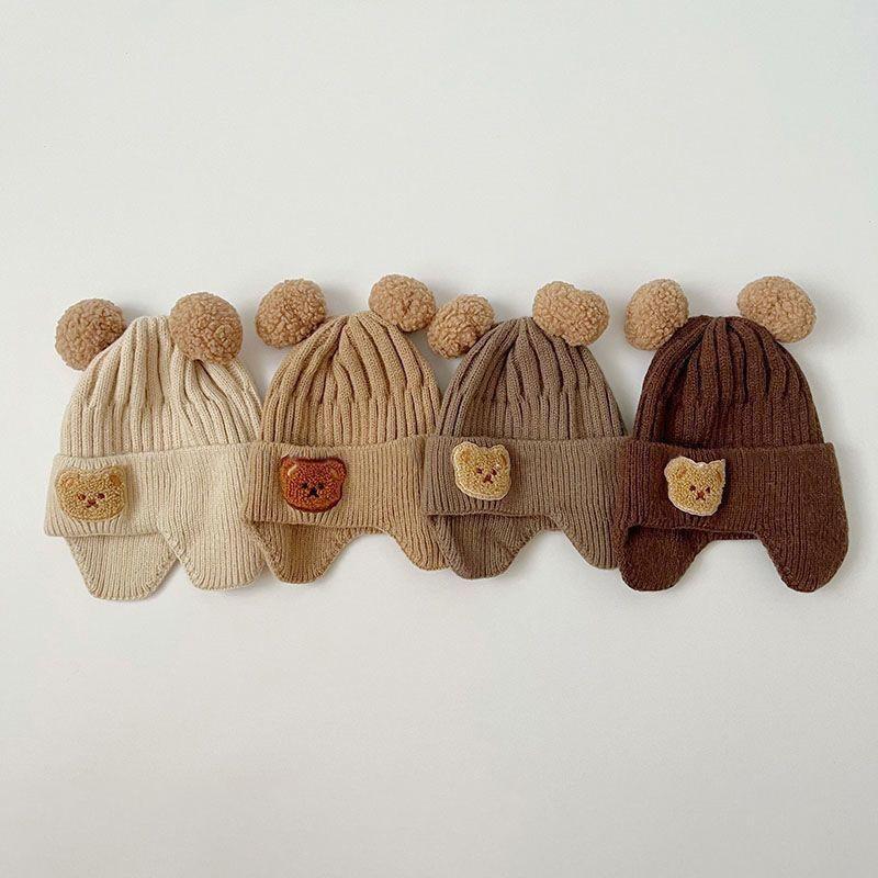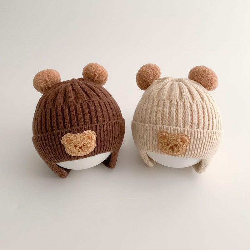 Новая детская шапка с милым медведем, зима-осень, теплые вязаные шапочки, шапки для маленьких мальчиков и девочек, шапки с защитой ушей, шапки