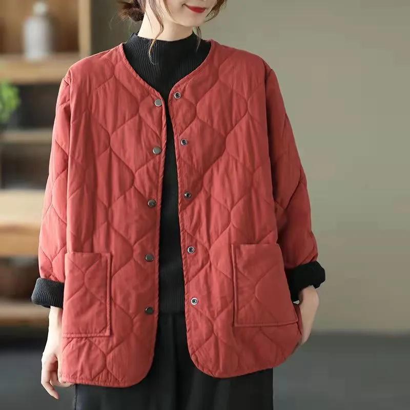 Осень-зима Мама Свободные женские короткая куртка с хлопковой подкладкой Повседневные пальто с круглым вырезом Осенние однотонные тонкие парки на пуговицах Карманы Одежда