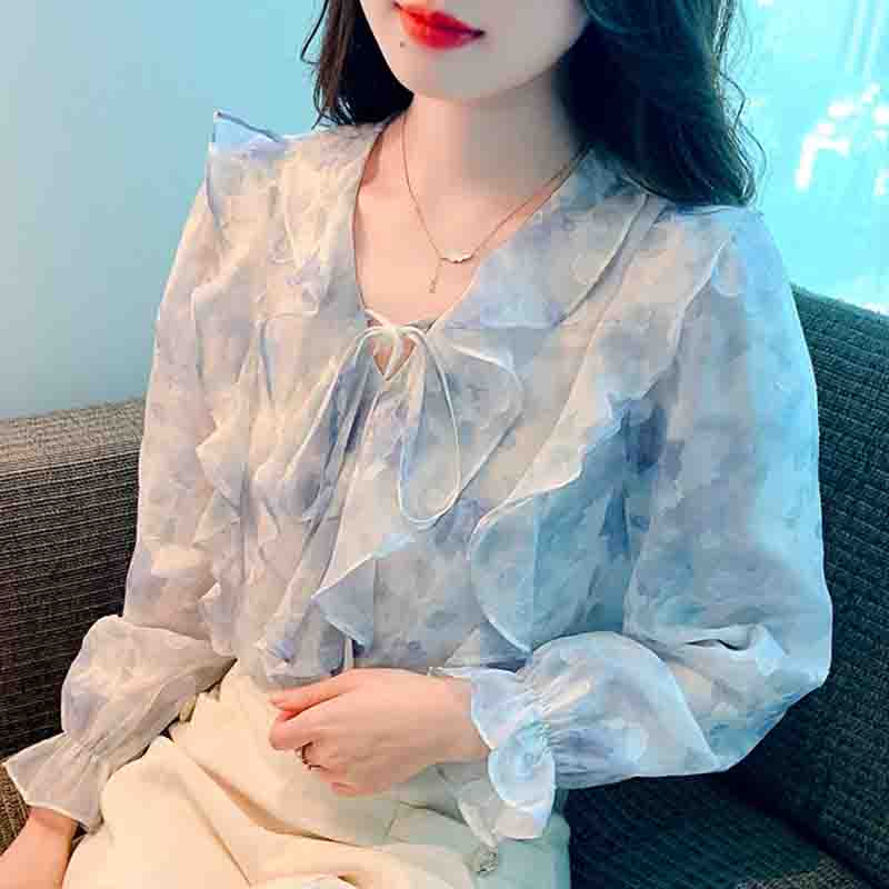 Осенняя мода 2024 года, повседневная шифоновая блузка с длинным рукавом и V-образным вырезом, с оборками и принтом, женская блузка, топы, рубашки J520 — купить товар онлайн с бесплатной доставкой по всему миру!