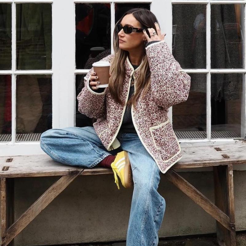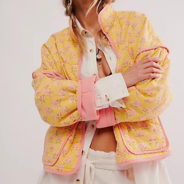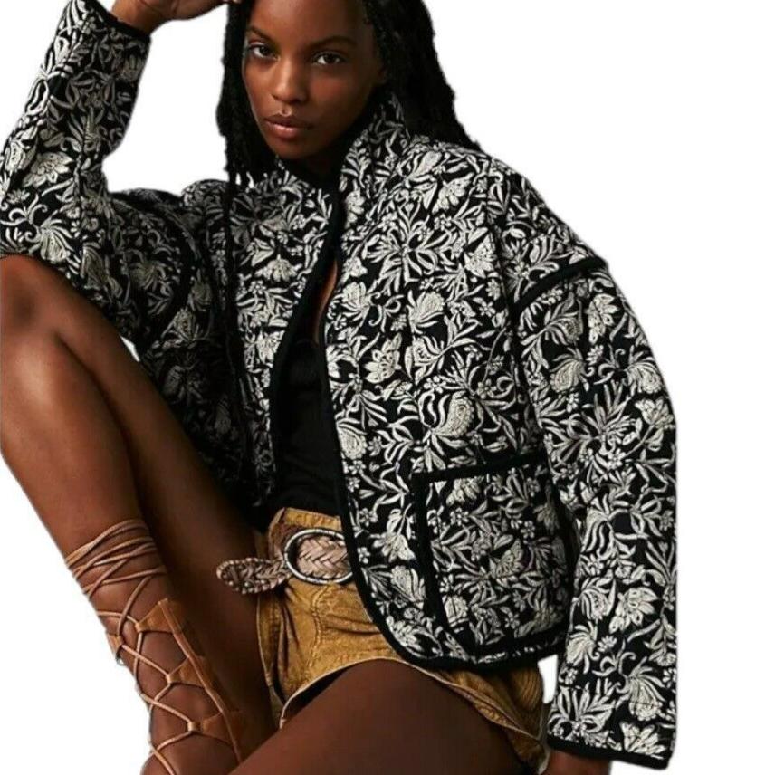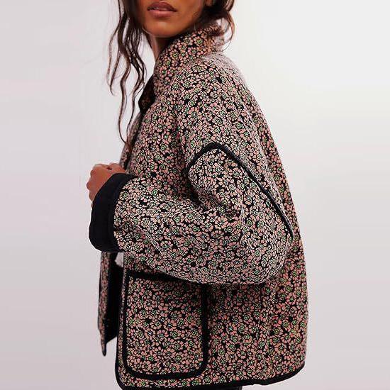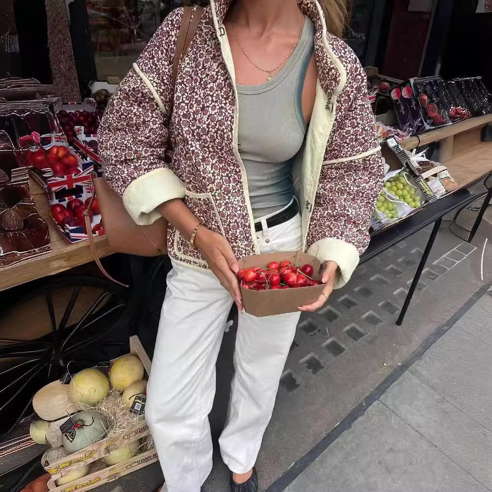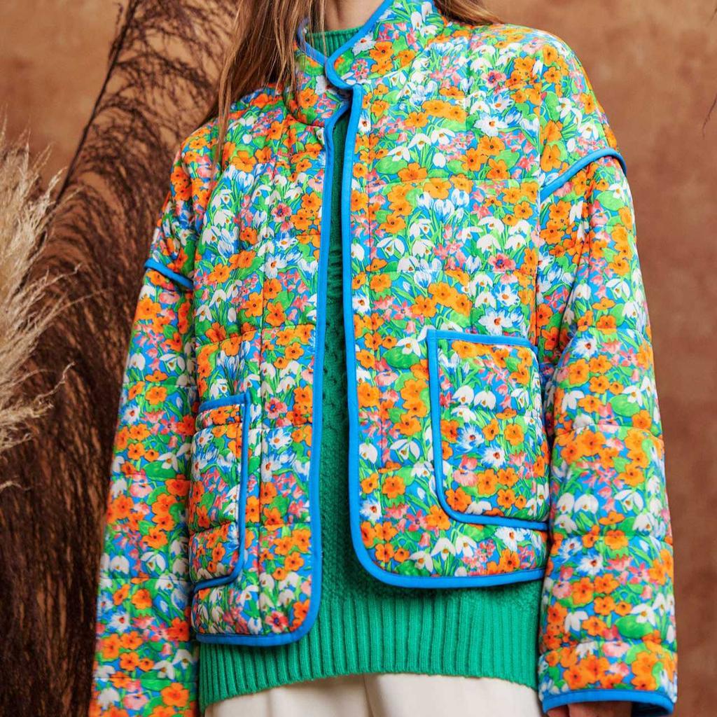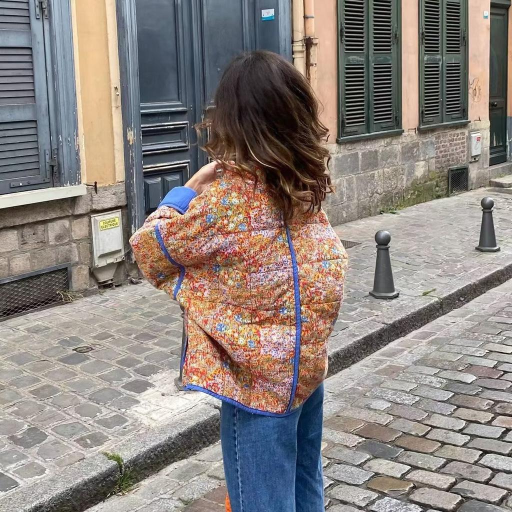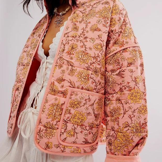 Женская стеганая куртка, легкая, с цветочным принтом, укороченная, стеганая, с открытым передом, верхняя одежда на осень-зиму для женщин, куртки с воротником-стойкой